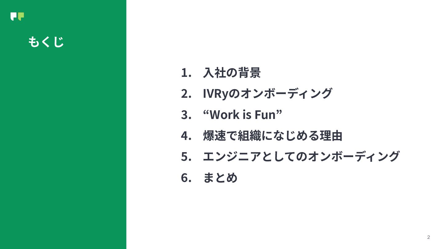 2 もくじ 1. ⼊社の背景 2. IVRyのオンボーディング 3. “Work is Fun”