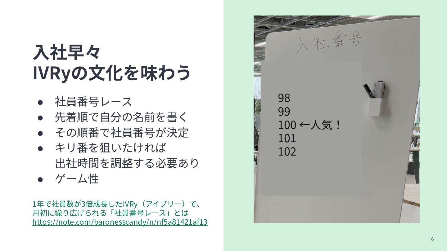 キリ番を狙いたければ 出社時間を調整する必要あり • ゲーム性 98 99 100 ←⼈気! 101 102 1年で社員数が3倍成⻑したIVRy(アイブリー)で、 ⽉初に繰り広げられる「社員番号レース」とは https://note.com/baronesscandy/n/nf5a81421af13