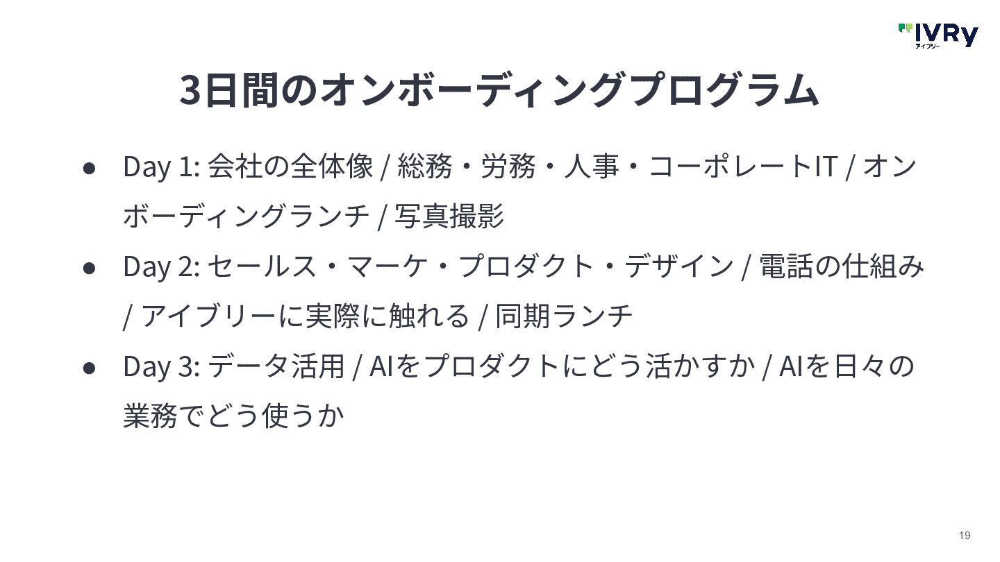 ボーディングランチ / 写真撮影 • Day 2: セールス‧マーケ‧プロダクト‧デザイン / 電話の仕組み / アイブリーに実際に触れる / 同期ランチ • Day 3: データ活⽤ / AIをプロダクトにどう活かすか / AIを⽇々の 業務でどう使うか