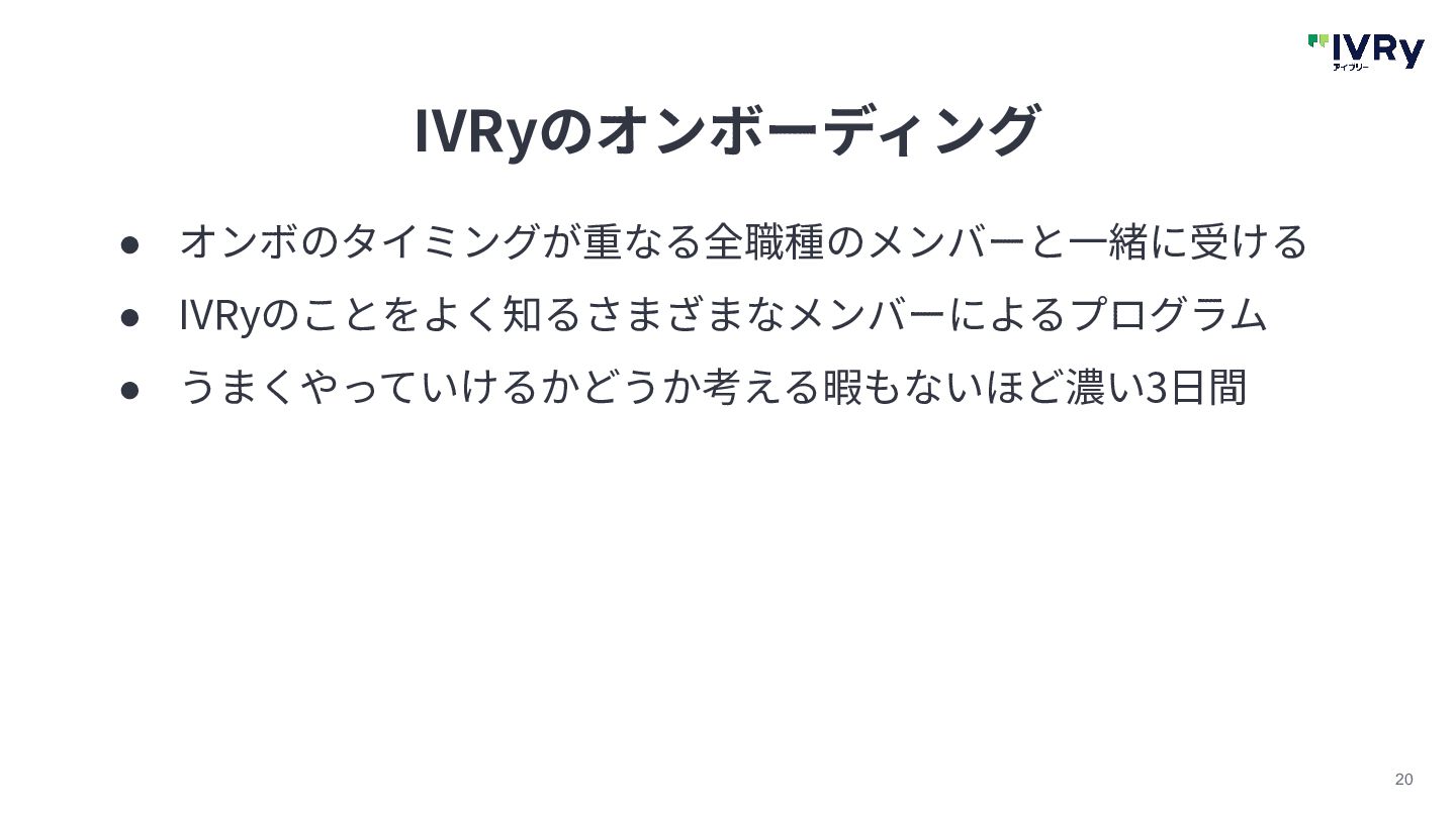 20 IVRyのオンボーディング • オンボのタイミングが重なる全職種のメンバーと⼀緒に受ける • IVRyのことをよく知るさまざまなメンバーによるプログラム • うまくやっていけるかどうか考える暇もないほど濃い3⽇間