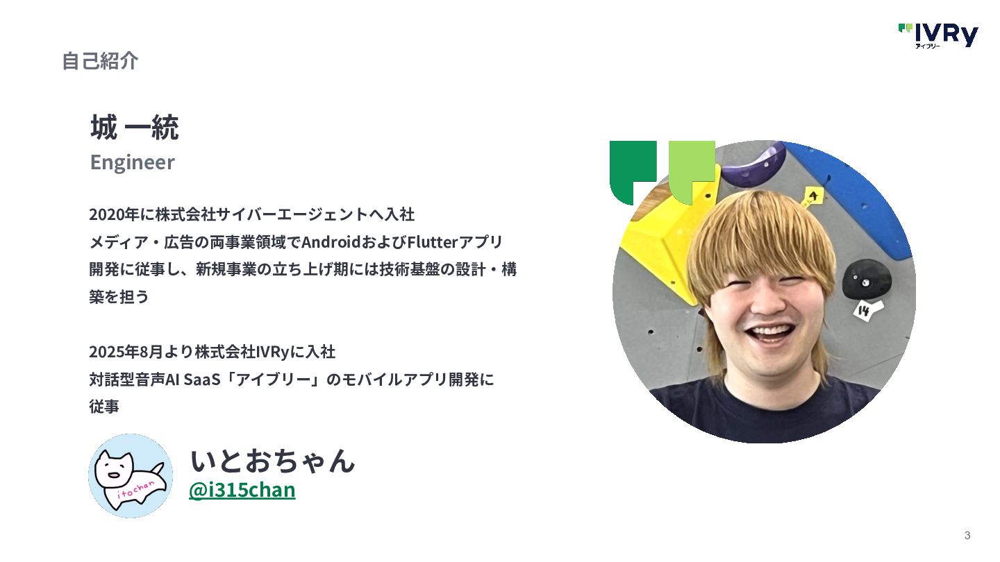 3 ⾃⼰紹介 2020年に株式会社サイバーエージェントへ⼊社 メディア‧広告の両事業領域でAndroidおよびFlutterアプリ 開発に従事し、新規事業の⽴ち上げ期には技術基盤の設計‧構 築を担う 2025年8⽉より株式会社IVRyに⼊社 対話型⾳声AI SaaS「アイブリー」のモバイルアプリ開発に 従事