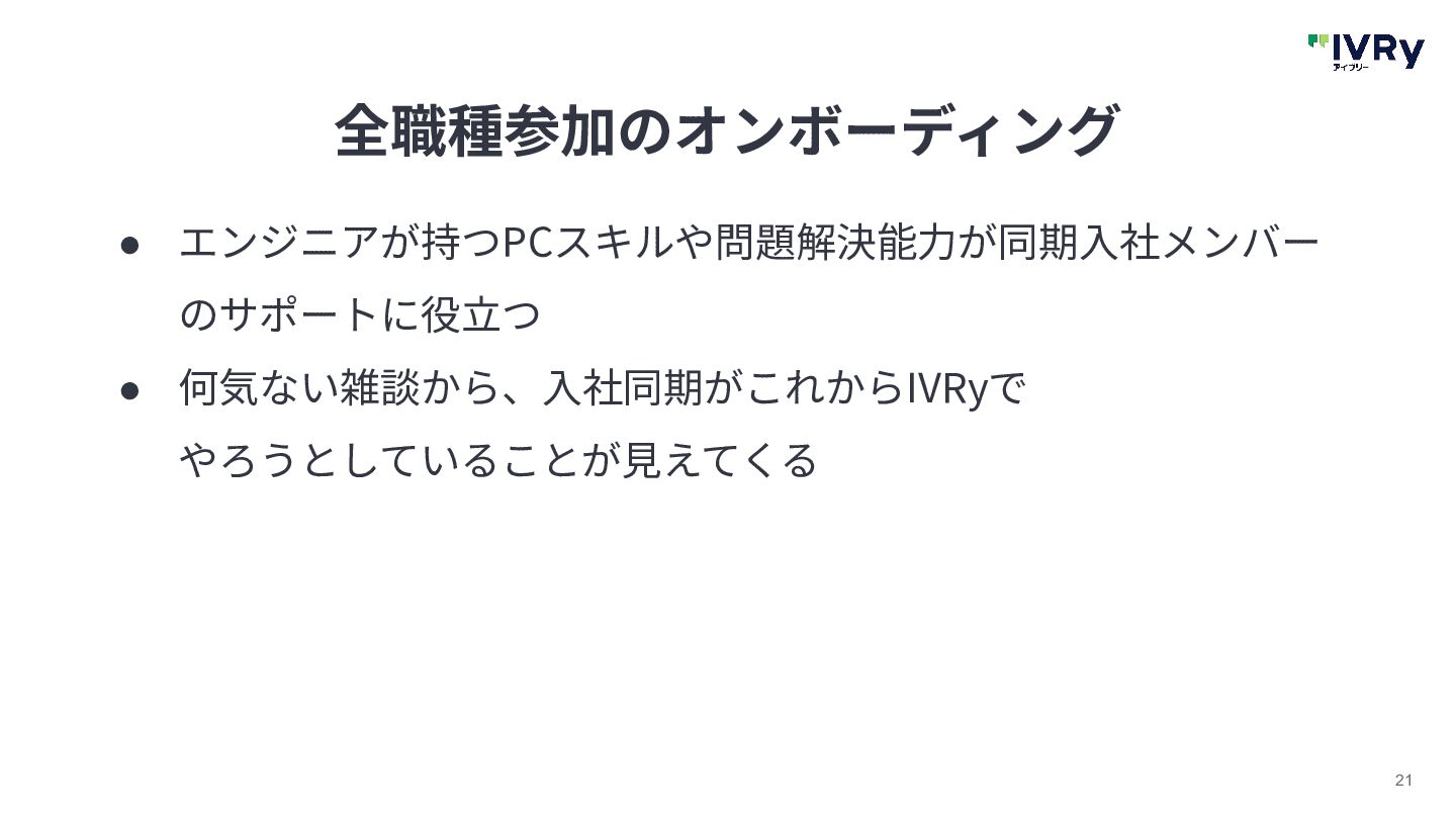 21 全職種参加のオンボーディング • エンジニアが持つPCスキルや問題解決能⼒が同期⼊社メンバー のサポートに役⽴つ • 何気ない雑談から、⼊社同期がこれからIVRyで やろうとしていることが⾒えてくる