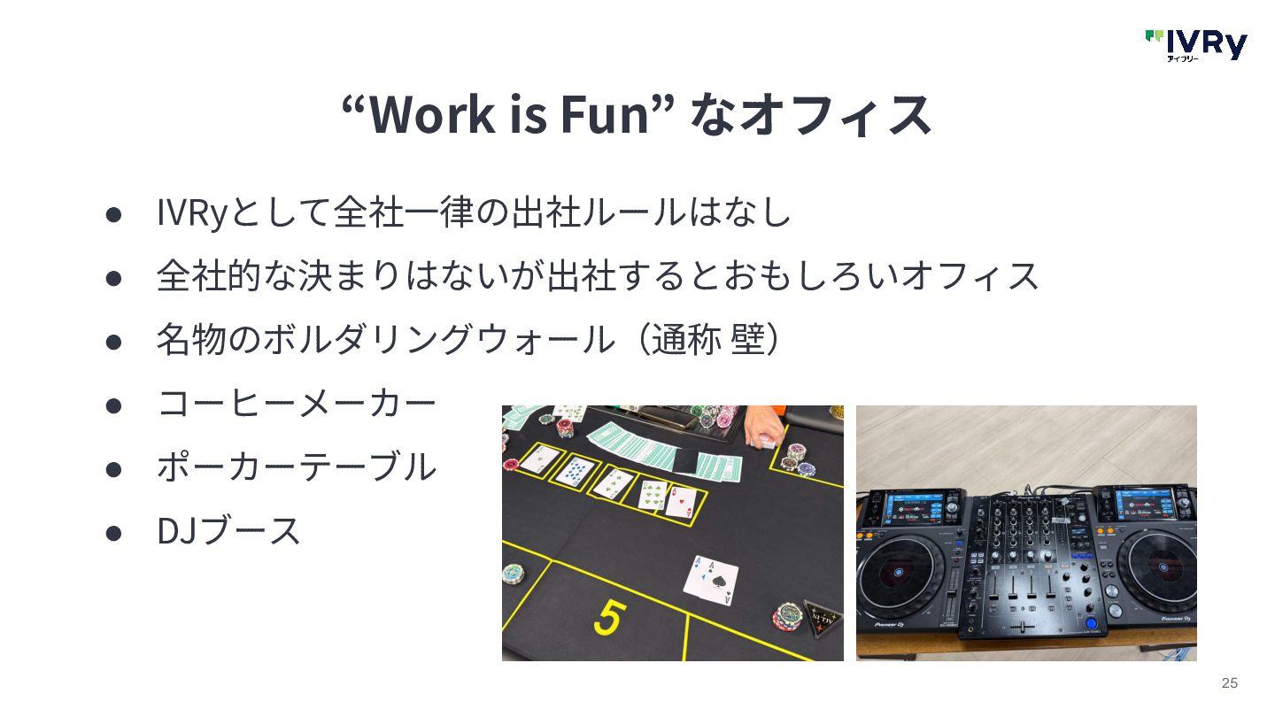 24 “Work is Fun” • “Work is Fun” なプロダクトをすべての⼈と企業に届けるために はIVRyの⼀員である⾃分たちも