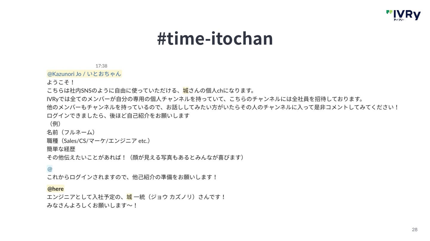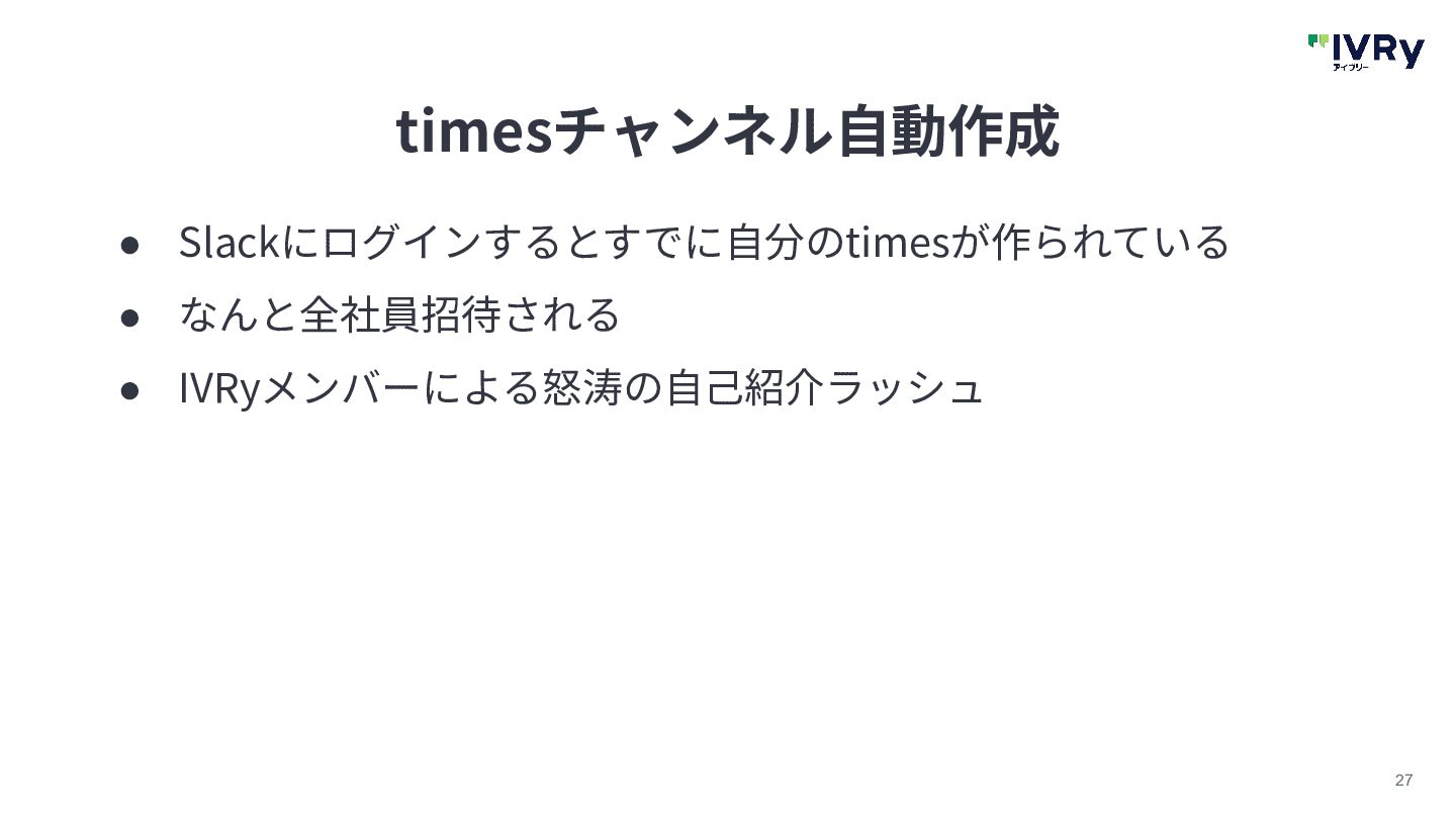27 timesチャンネル⾃動作成 • Slackにログインするとすでに⾃分のtimesが作られている • なんと全社員招待される • IVRyメンバーによる怒涛の⾃⼰紹介ラッシュ