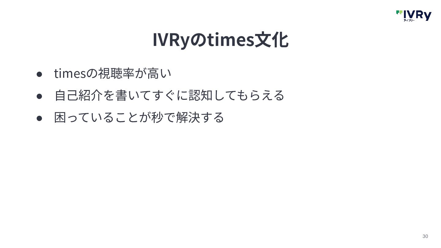 30 IVRyのtimes⽂化 • timesの視聴率が⾼い • ⾃⼰紹介を書いてすぐに認知してもらえる • 困っていることが秒で解決する
