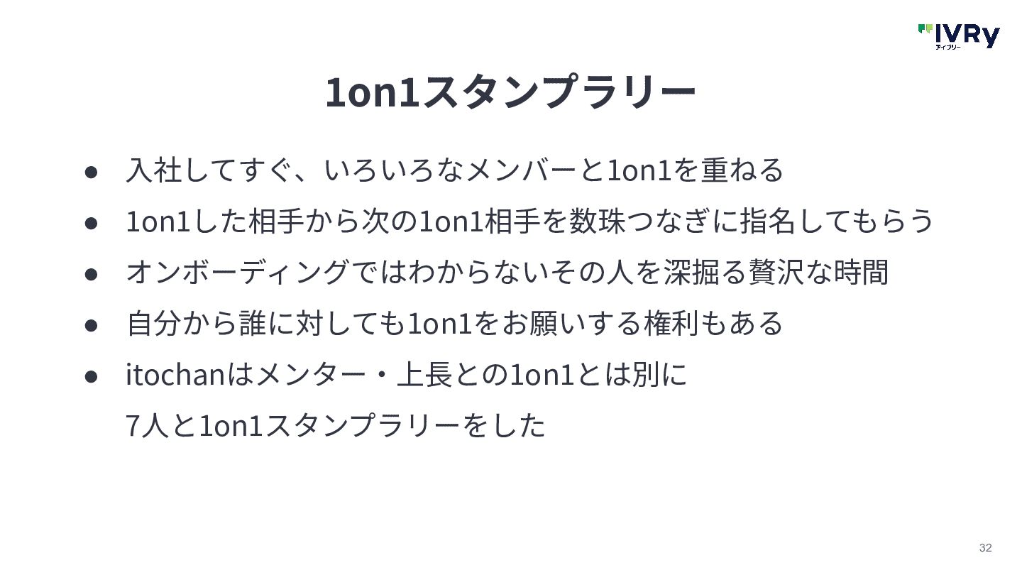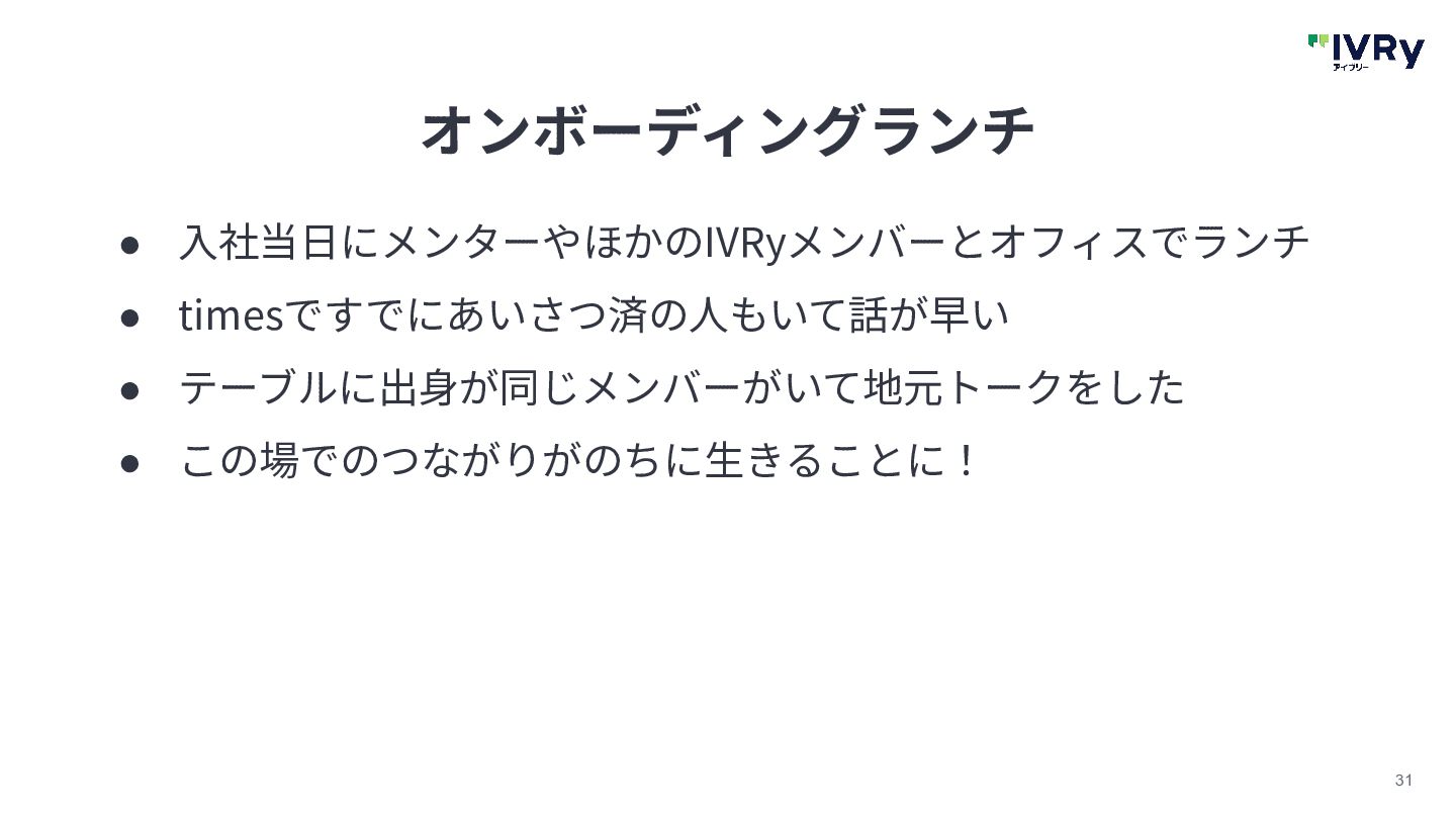 31 オンボーディングランチ • ⼊社当⽇にメンターやほかのIVRyメンバーとオフィスでランチ • timesですでにあいさつ済の⼈もいて話が早い • テーブルに出⾝が同じメンバーがいて地元トークをした • この場でのつながりがのちに⽣きることに!