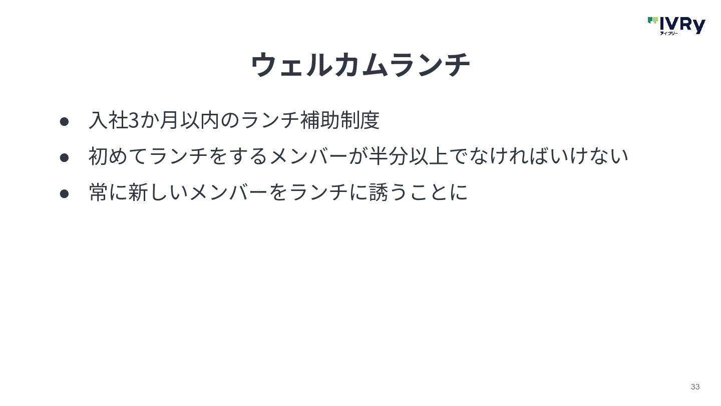 33 ウェルカムランチ • ⼊社3か⽉以内のランチ補助制度 • 初めてランチをするメンバーが半分以上でなければいけない • 常に新しいメンバーをランチに誘うことに