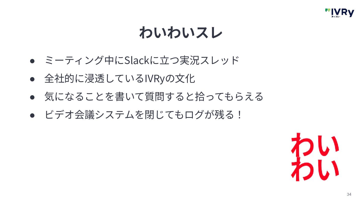 34 わいわいスレ • ミーティング中にSlackに⽴つ実況スレッド • 全社的に浸透しているIVRyの⽂化 • 気になることを書いて質問すると拾ってもらえる • ビデオ会議システムを閉じてもログが残る!