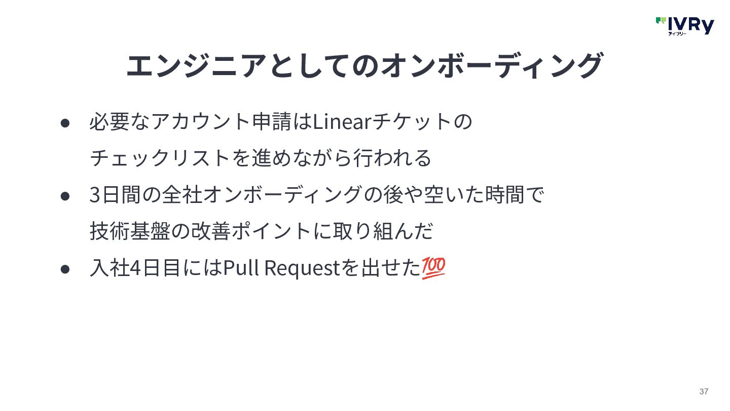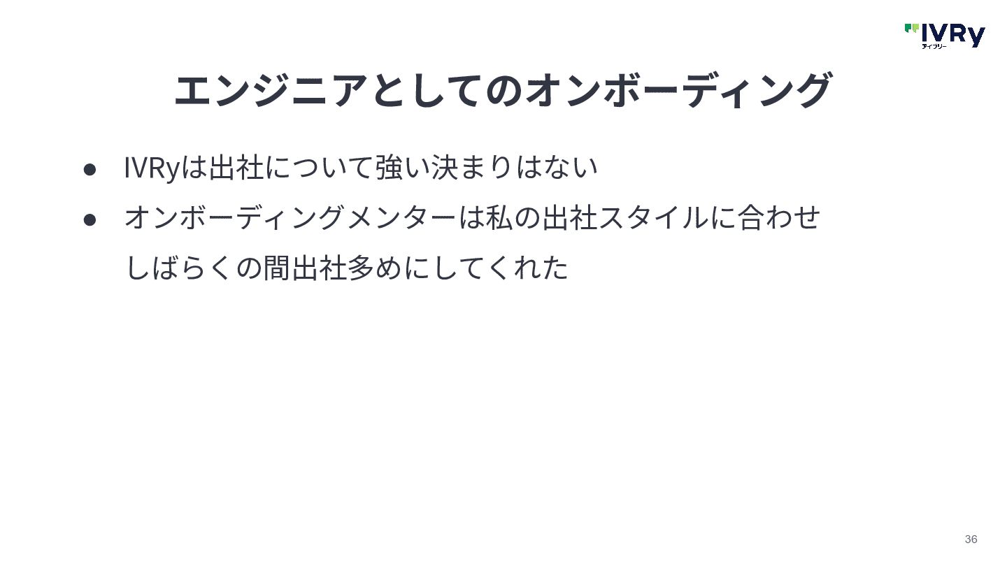 36 エンジニアとしてのオンボーディング • IVRyは出社について強い決まりはない • オンボーディングメンターは私の出社スタイルに合わせ しばらくの間出社多めにしてくれた