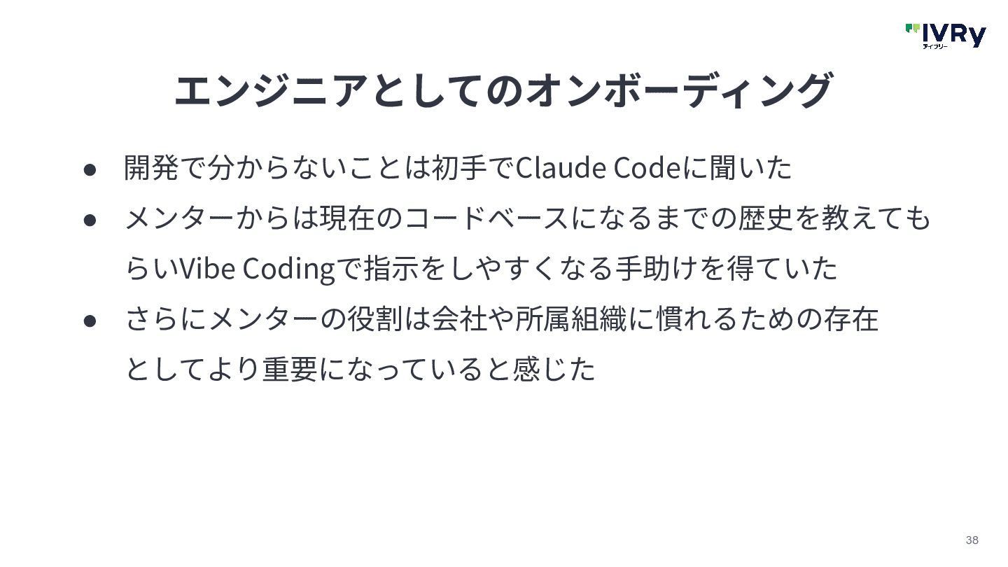 38 エンジニアとしてのオンボーディング • 開発で分からないことは初⼿でClaude Codeに聞いた • メンターからは現在のコードベースになるまでの歴史を教えても らいVibe Codingで指⽰をしやすくなる⼿助けを得ていた •