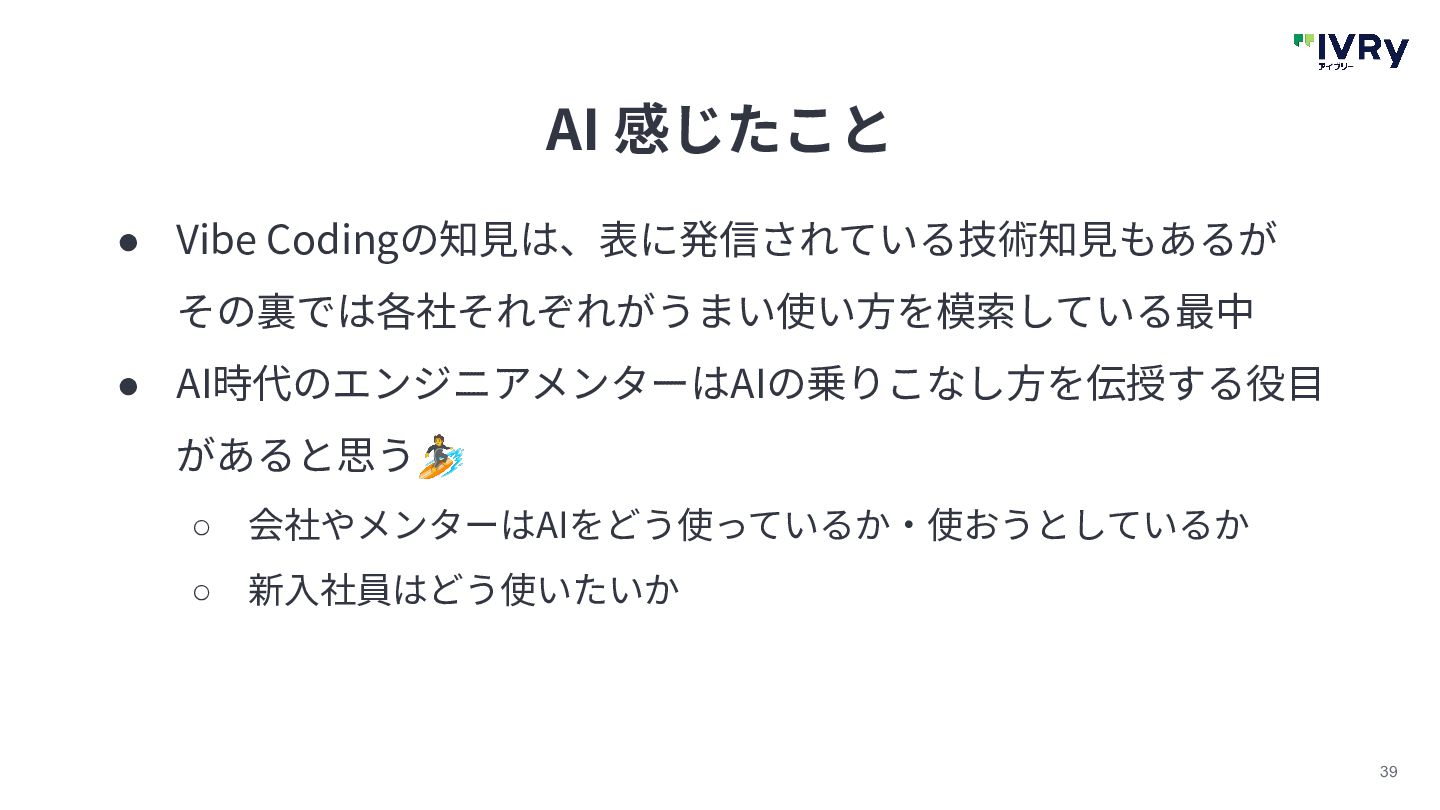 39 AI 感じたこと • Vibe Codingの知⾒は、表に発信されている技術知⾒もあるが その裏では各社それぞれがうまい使い⽅を模索している最中 • AI時代のエンジニアメンターはAIの乗りこなし⽅を伝授する役⽬ があると思う🏄