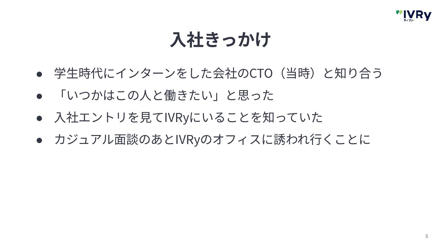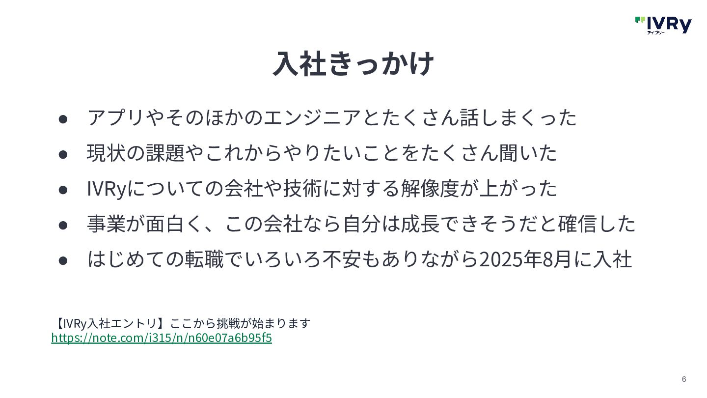 5 ⼊社きっかけ • 学⽣時代にインターンをした会社のCTO(当時)と知り合う • 「いつかはこの⼈と働きたい」と思った • ⼊社エントリを⾒てIVRyにいることを知っていた • カジュアル⾯談のあとIVRyのオフィスに誘われ⾏くことに