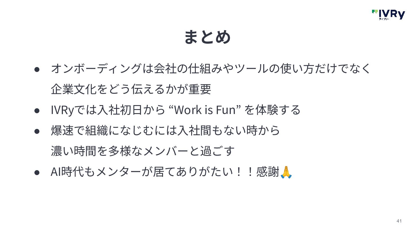 41 まとめ • オンボーディングは会社の仕組みやツールの使い⽅だけでなく 企業⽂化をどう伝えるかが重要 • IVRyでは⼊社初⽇から “Work is Fun”