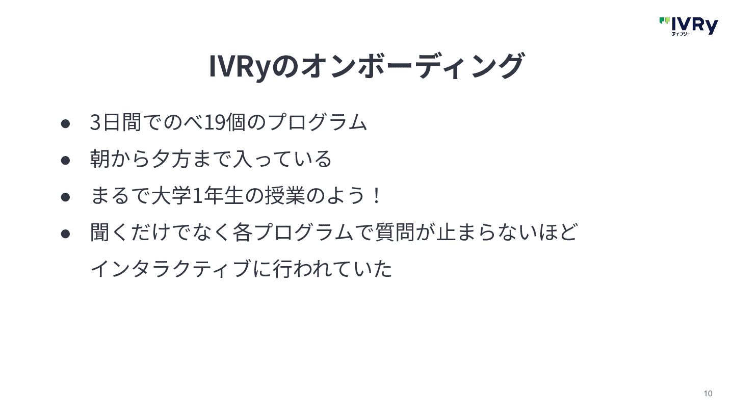 10 IVRyのオンボーディング • 3⽇間でのべ19個のプログラム • 朝から⼣⽅まで⼊っている • まるで⼤学1年⽣の授業のよう! • 聞くだけでなく各プログラムで質問が⽌まらないほど