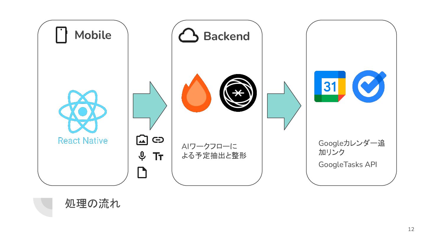 12 Mobile Backend AIワークフローに よる予定抽出と整形 Googleカレンダー追 加リンク GoogleTasks API 処理の流れ