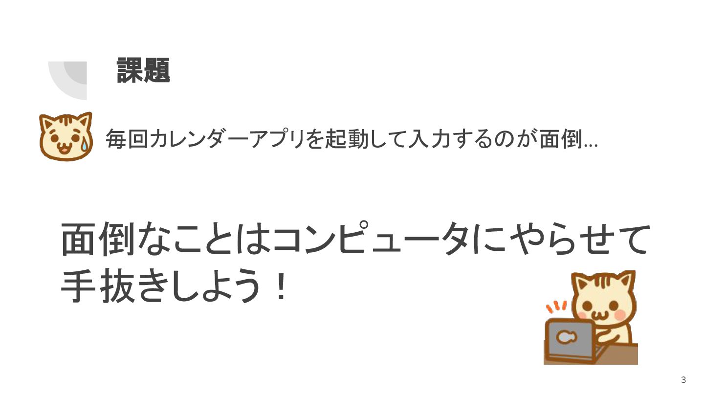 課題 3 毎回カレンダーアプリを起動して入力するのが面倒... 面倒なことはコンピュータにやらせて 手抜きしよう!