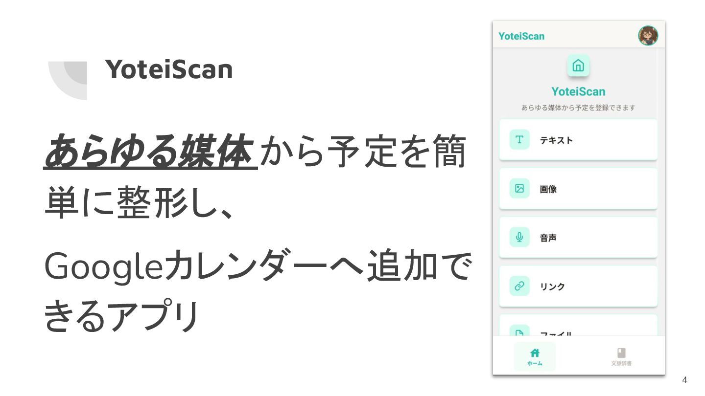 YoteiScan あらゆる媒体 から予定を簡 単に整形し、 Googleカレンダーへ追加で きるアプリ 4