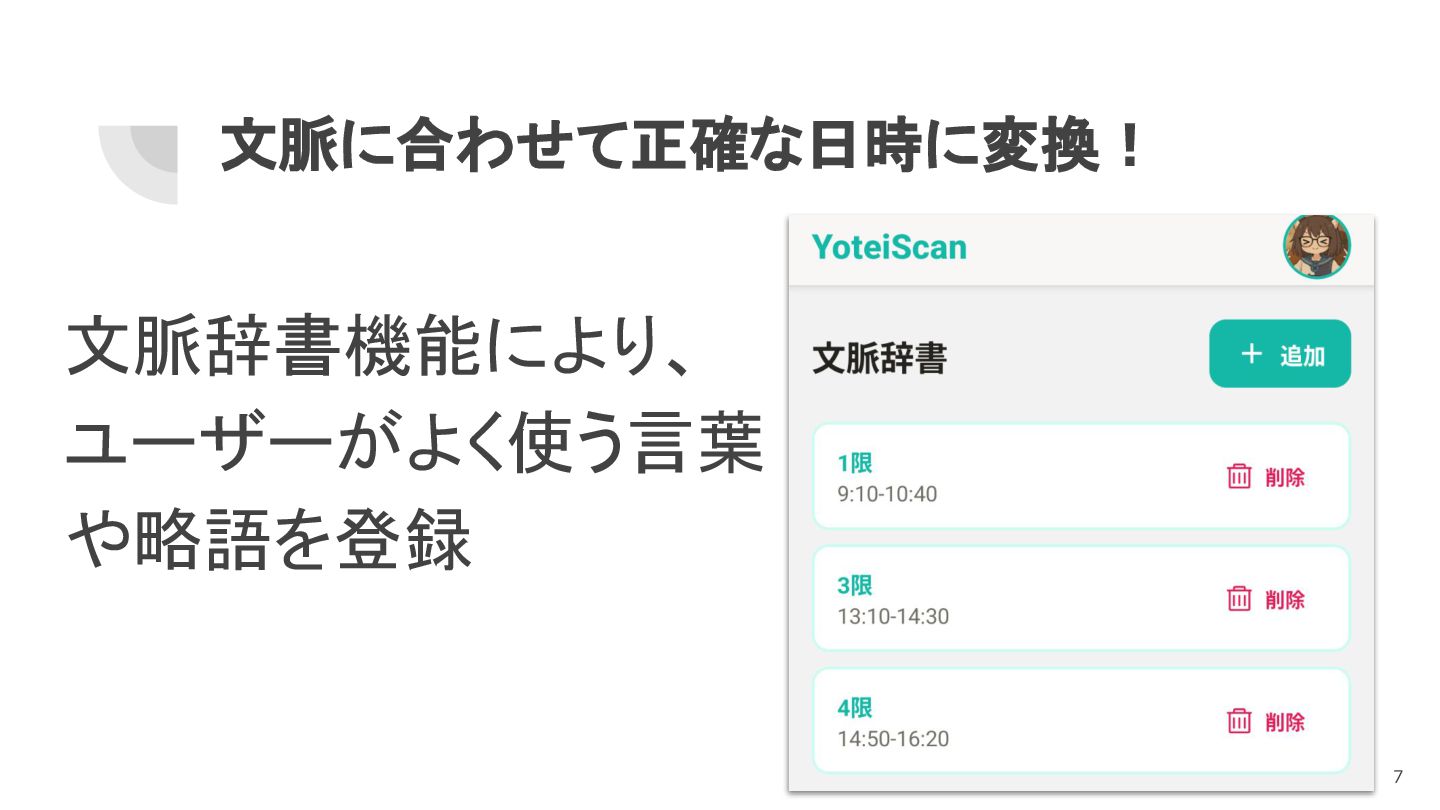 文脈に合わせて正確な日時に変換! 文脈辞書機能により、 ユーザーがよく使う言葉 や略語を登録 7