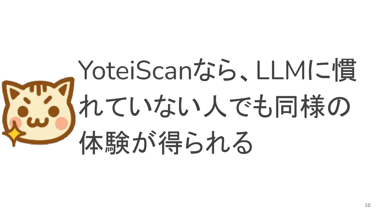 10 YoteiScanなら、LLMに慣 れていない人でも同様の 体験が得られる