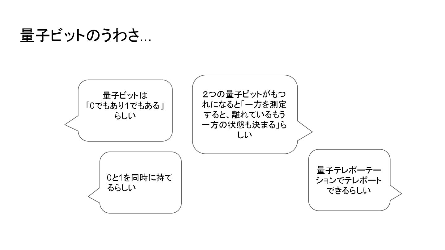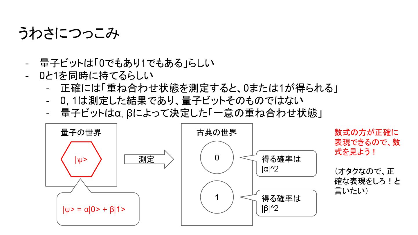 うわさにつっこみ - 量子ビットは「0でもあり1でもある」らしい - 0と1を同時に持てるらしい - 正確には「重ね合わせ状態を測定すると、0または1が得られる」 - 0, 1は測定した結果であり、量子ビットそのものではない