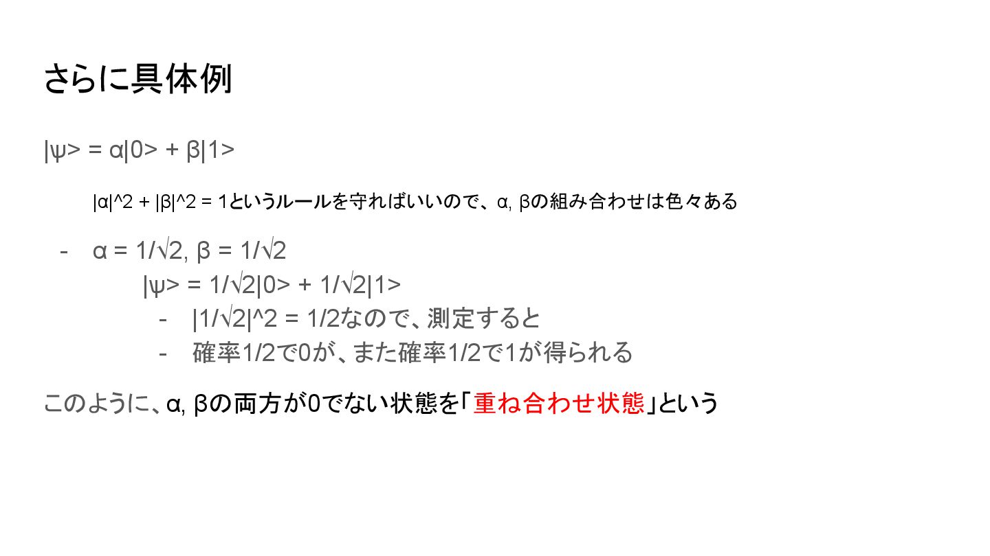 1というルールを守ればいいので、 α, βの組み合わせは色々ある - α = 1/√2, β = 1/√2 |ѱ> = 1/√2|0> + 1/√2|1> - |1/√2|^2 = 1/2なので、測定すると - 確率1/2で0が、また確率1/2で1が得られる このように、α, βの両方が0でない状態を「重ね合わせ状態」という