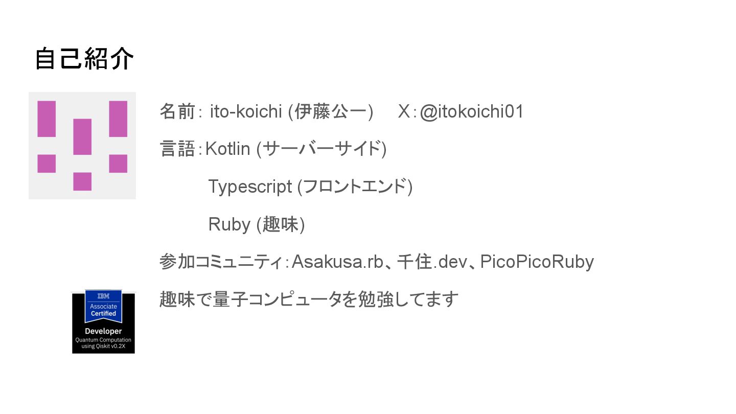 参加コミュニティ:Asakusa.rb、千住.dev、PicoPicoRuby 趣味で量子コンピュータを勉強してます