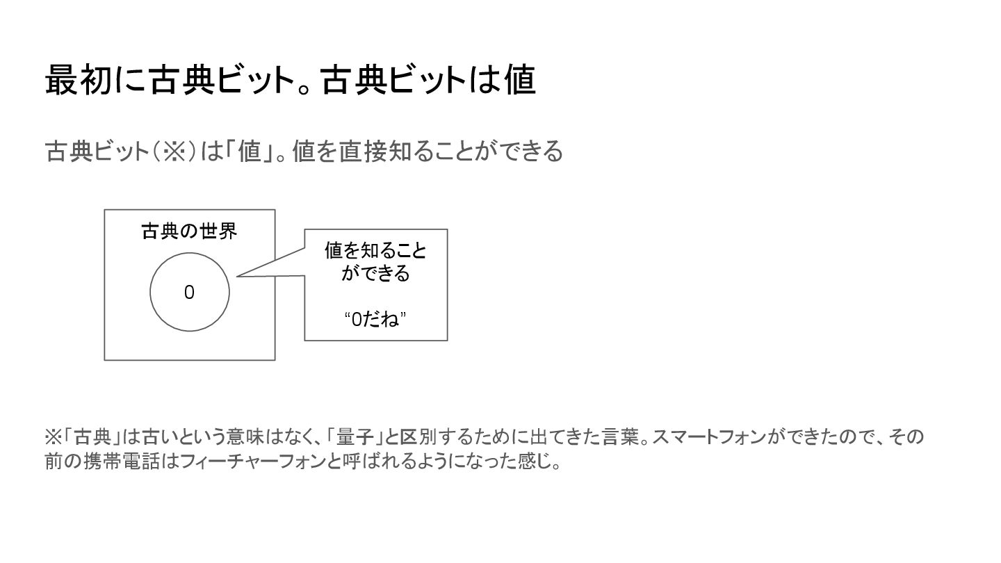 最初に古典ビット。古典ビットは値 古典ビット(※)は「値」。値を直接知ることができる ※「古典」は古いという意味はなく、「量子」と区別するために出てきた言葉。スマートフォンができたので、その 前の携帯電話はフィーチャーフォンと呼ばれるようになった感じ。 古典の世界 0 値を知ること ができる “0だね”