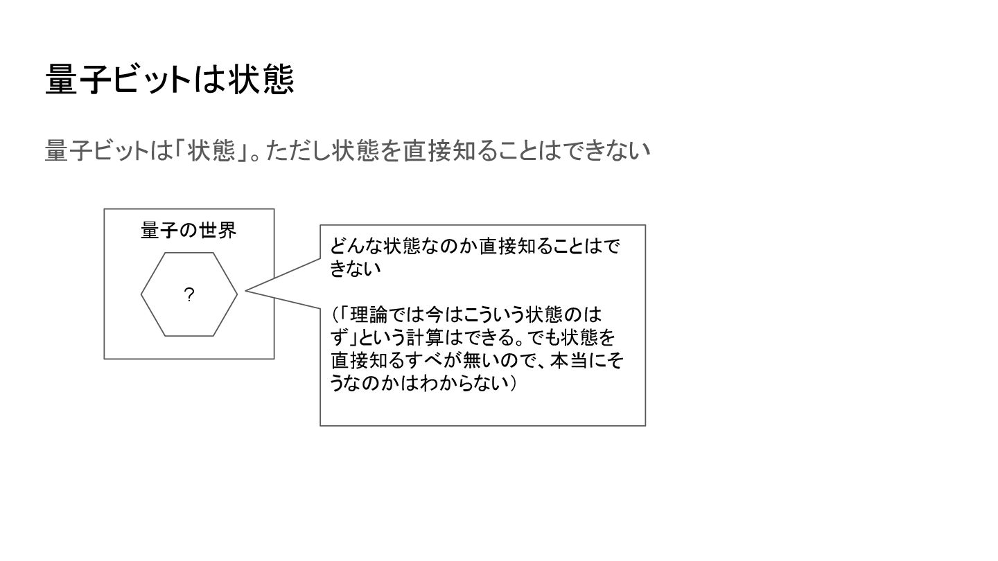 量子ビットは状態 量子ビットは「状態」。ただし状態を直接知ることはできない 量子の世界 どんな状態なのか直接知ることはで きない (「理論では今はこういう状態のは ず」という計算はできる。でも状態を 直接知るすべが無いので、本当にそ うなのかはわからない) ?
