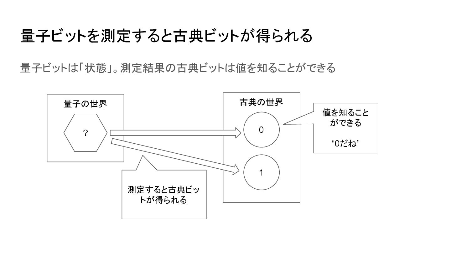 量子ビットを測定すると古典ビットが得られる 量子ビットは「状態」。測定結果の古典ビットは値を知ることができる 量子の世界 ? 古典の世界 0 測定すると古典ビッ トが得られる 1 値を知ること