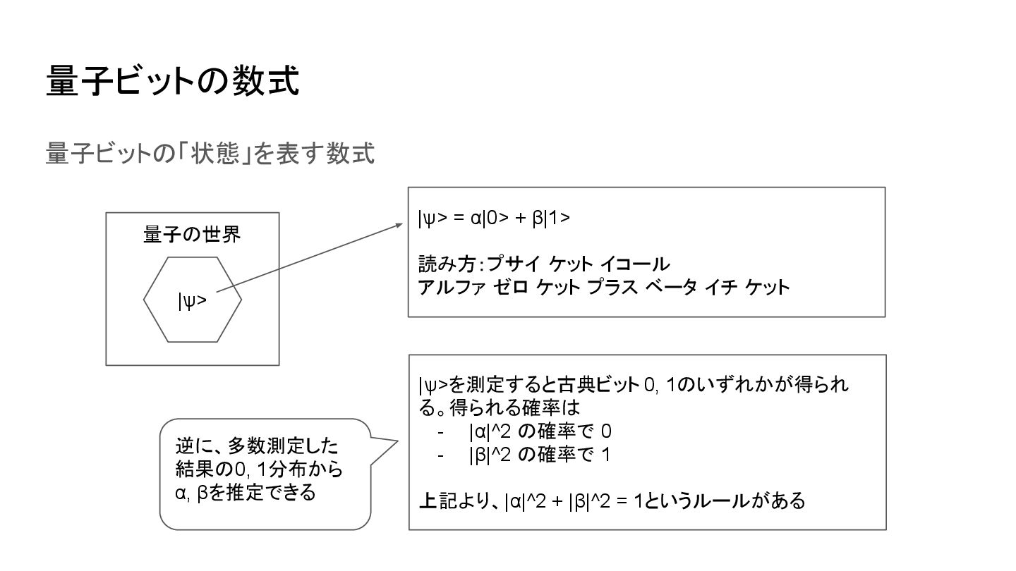 - 量子ビットはα, βによって決定した「一意の重ね合わせ状態」 量子の世界 |ѱ> 古典の世界 0 測定 1 |ѱ> = α|0> + β|1> 数式の方が正確に 表現できるので、数 式を見よう! (オタクなので、正 確な表現をしろ!と 言いたい) 得る確率は |α|^2 得る確率は |β|^2