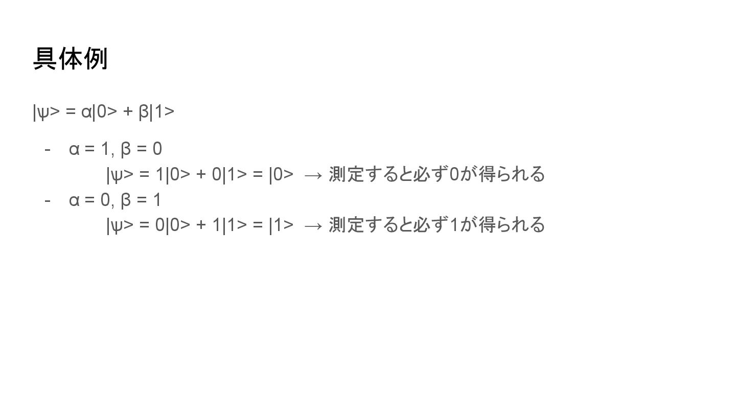β = 0 |ѱ> = 1|0> + 0|1> = |0> → 測定すると必ず0が得られる - α = 0, β = 1 |ѱ> = 0|0> + 1|1> = |1> → 測定すると必ず1が得られる