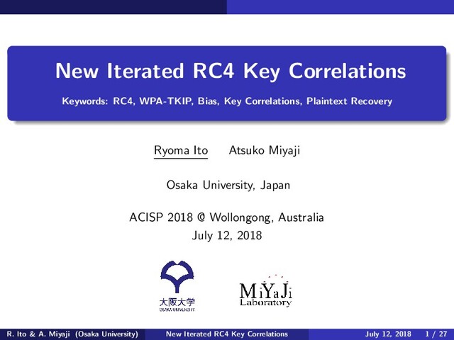 Weaknesses in the Key Scheduling Algorithm of RC4. In Serge Vaudenay and Amr M. Youssef, editors, Selected Areas in Cryptography - SAC 2001, volume 2259 of Lecture Notes in Computer Science, pages 1–24. Springer Berlin Heidelberg, 2001. [GMM+14] Sourav Sen Gupta, Subhamoy Maitra, Willi Meier, Goutam Paul, and Santanu Sarkar. Dependence in IV-related bytes of RC4 key enhances vulnerabilities in WPA. In Carlos Cid and Christian Rechberger, editors, Fast Software Encryption - FSE 2014, volume 8540 of Lecture Notes in Computer Science, pages 350–369. Springer Berlin Heidelberg, 2014. [IOWM13] Takanori Isobe, Toshihiro Ohigashi, Yuhei Watanabe, and Masakatu Morii. Full Plaintext Recovery Attack on Broadcast RC4. In Shiho Moriai, editor, Fast Software Encryption - FSE 2013, volume 8424 of Lecture Notes in Computer Science. Springer Berlin Heidelberg, 2013. [PPS14] Kenneth G. Paterson, Bertram Poettering, and Jacob C.N. Schuldt. Plaintext Recovery Attacks Against WPA/TKIP. In Carlos Cid and Christian Rechberger, editors, Fast Software Encryption - FSE 2014, volume 8540 of Lecture Notes in Computer Science, pages 325–349. Springer Berlin Heidelberg, 2014. [Sar14] Santanu Sarkar. Proving Empirically key-correlations in RC4. Information Processing Letters, 114 (5):234–238, 2014. R. Ito & A. Miyaji (Osaka University) New Iterated RC4 Key Correlations July 12, 2018 27 / 27