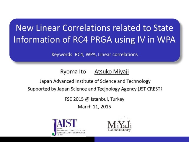 proved correlations Our results New linear correlations 11 March 11, 2015 FSE 2015 @ Istanbul, Turkey 0 1 2 255 S0 S254 S1 S255 New linear correlations S0 [i1 ] = K[0] (Theorems 1, 2) S0 [i1 ] = K[0]-K[1]-3(Theorem 3) S0 [i1 ] = K[0]-K[1]-1 (Theorem 4) S255 [i256 ]=K[0] (Theorem 5) S255 [i256 ]=K[1] (Theorem 6) Sr [ir+1 ]=K[0]+K[1]+1 (r ϵ [0, N], Theorem 7) Xr =a・Zr+1 +b・K[0]+c・K[1]+d・K[2]+e unknown internal states: Xr ϵ {Sr [ir+1 ], Sr [ jr+1 ], jr+1 , tr+1 } and K[0], K[1], K[2], r ϵ [0, 256], a,b,c,d ϵ {-1, 0, 1}, e ϵ {-3, -2, -1, 0, 1, 2, 3},