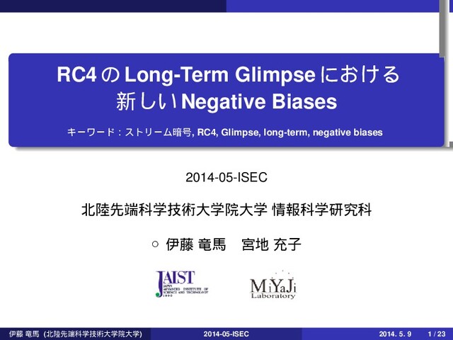 Apurba Das, Subhamoy Maitra, Goutam Paul, and Santanu Sarkar, “Some Combinatorial Results towards State Recovery Attack on RC4”, ICISS 2011, LNCS 7093, pp. 204-214, 2011. [2] Sourav Sen Gupta, Subhamoy Maitra, Goutam Paul, and Santanu Sarkar, “(Non-)random sequences from (non-)random permutations - analysis of RC4 stream cipher”, Journal of Cryptology, 2013. [3] Sourav Sen Gupta, Subhamoy Maitra, Goutam Paul, and Santanu Sarkar, “Proof of Empirical RC4 Biases and New Key Correlations”, SAC 2010, LNCS 7118, pp. 151-168, 2011. [4] Takanori Isobe, Toshihiro Ohigashi, Yuhei Watanabe, and Masakatu Morii, “Full Plaintext Recovery Attack on Broadcast RC4”, FSE 2013 [5] Jenkins, R.J., ISAAC and RC4 (1996), Published on the Internet at http://burtleburtle.net/bob/rand/isaac.html (last accessed on March 10, 2014) [6] Subhamoy Maitra, and Sourav Sen Gupta, “New Long-Term Glimpse of RC4 Stream Cipher”, ICISS 2013, LNCS 8303, pp. 230-238, 2013. [7] Subhamoy Maitra, Goutam Paul, Santaunu Sarkar, Michael Lehmann, and Willi Meier, “New Results on Generalization of Roos-Type Biases and Related Keystreams of RC4”, AFRICACRYPT 2013, LNCS 7918, pp. 222-239, 2013. [8] Itsik Mantin and Adi Shamir, “A practical attack on broadcast RC4”, FSE 2001, LNCS 2355, pp. 152-164, 2002. [9] Alexander Maximov, and Dmitry Khovratovich, “New State Recovery Attack on RC4”, CRYPTO 2008, LNCS 5157, pp. 297-316, 2008. [10] Santanu Sarkar, Sourav Sen Gupta, Goutam Paul, and Subhamoy Maitra, “Proving TLS-attack related open biases of RC4”, IACR Cryptology ePrint Archive, 2013:508, 2013. [11] Pouyan Sepehrdad, Serge Vaudenay, and Martin Vuagnoux, “Discovery and Exploitation of New Biases in RC4”, SAC 2010, LNCS 6554, pp. 74-91, 2011 ҏ౻ ཽഅ (ઌՊֶٕज़େֶӃେֶ) 2014-05-ISEC 2014. 5. 9 23 / 23