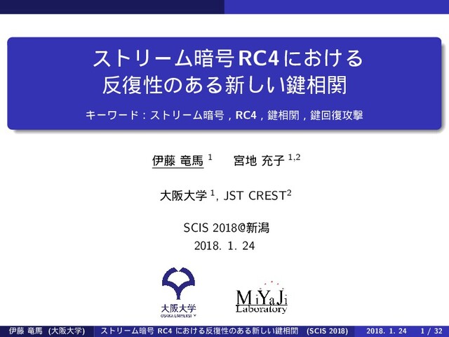 Masakatu Morii. Full Plaintext Recovery Attack on Broadcast RC4. In Shiho Moriai, editor, Fast Software Encryption - FSE 2013, volume 8424 of Lecture Notes in Computer Science. Springer Berlin Heidelberg, 2013. [MP08] Subhamoy Maitra and Goutam Paul. New Form of Permutation Bias and Secret Key Leakage in Keystream Bytes of RC4. In Kaisa Nyberg, editor, Fast Software Encryption - FSE 2008, volume 5086 of Lecture Notes in Computer Science, pages 253–269. Springer Berlin Heidelberg, 2008. [Pop15] Andrey Popov. Prohibiting RC4 cipher suites. Internet Engineering Task Force - IETF, Request for Comments, 7465, February 2015. [Sar14] Santanu Sarkar. Proving Empirically key-correlations in RC4. Information Processing Letters, 114 (5):234–238, 2014. [SVV11] Pouyan Sepehrdad, Serge Vaudenay, and Martin Vuagnoux. Discovery and Exploitation of New Biases in RC4. In Alex Biryukov, Guang Gong, and Douglas R. Stinson, editors, Selected Areas in Cryptography - SAC 2010, volume 6544 of Lecture Notes in Computer Science, pages 74–91. Springer Berlin Heidelberg, 2011. [VP15] Mathy Vanhoef and Frank Piessens. All Your Biases Belong to Us: Breaking RC4 in WPA-TKIP and TLS. In USENIX Security Symposium 2015, pages 97–112, 2015. [VV07] Serge Vaudenay and Martin Vuagnoux. Passive – only Key Recovery Attack on RC4. In Carlisle Adams, Ali Miri, and Michael Wiener, editors, Selected Areas in Cryptography - SAC 2007, volume 4876 of Lecture Notes in Computer Science, pages 344–359. Springer Berlin Heidelberg, 2007. ҏ౻ ཽഅ (େࡕେֶ) ετϦʔϜ҉߸ RC4 ʹ͓͚Δ෮ੑͷ͋Δ৽͍͠ݤ૬ؔ (SCIS 2018) 2018. 1. 24 32 / 32