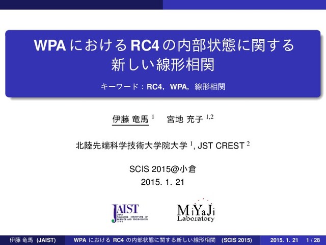 G. Paterson, Bertram Poettering, and Jacob C. N. Schuldt. On the Security of RC4 in TLS. In USENIX Security Symposium 2013, 2013. [DMPS11] Apurba Das, Subhamoy Maitra, Goutam Paul, and Santanu Sarkar. Some Combinatorial Results towards State Recovery Attack on RC4. In Sushil Jajodia and Chandan Mazumdar, editors, Information Systems Security - ICISS 2011, volume 7093 of Lecture Notes in Computer Science, pages 204–214. Springer Berlin Heidelberg, 2011. [FMS01] Scott Fluhrer, Itsik Mantin, and Adi Shamir. Weaknesses in the Key Scheduling Algorithm of RC4. In Serge Vaudenay and Amr M. Youssef, editors, Selected Areas in Cryptography - SAC 2001, volume 2259 of Lecture Notes in Computer Science, pages 1–24. Springer Berlin Heidelberg, 2001. [GMM+14] Sourav Sen Gupta, Subhamoy Maitra, Willi Meier, Goutam Paul, and Santanu Sarkar. Dependence in IV-related bytes of RC4 key enhances vulunerabilities in WPA. In Fast Software Encryption - FSE 2014. To appear, 2014. [GMPS11] Sourav Sen Gupta, Subhamoy Maitra, Goutam Paul, and Santanu Sarkar. Proof of Empirical RC4 Biases and New Key Correlations. In Ali Miri and Serge Vaudenay, editors, Selected Areas in Cryptography - SAC 2011, volume 7118 of Lecture Notes in Computer Science, pages 151–168. Springer Berlin Heidelberg, 2011. [IOWM14] Takanori Isobe, Toshihiro Ohigashi, Yuhei Watanabe, and Masakatu Morii. Full Plaintext Recovery Attack on Broadcast RC4. In Shiho Moriai, editor, Fast Software Encryption - FSE 2013, volume 8424 of Lecture Notes in Computer Science. Springer Berlin Heidelberg, 2014. [Jen96] R. J. Jenkins. ISAAC and RC4. http://burtleburtle.net/bob/rand/isaac.html, 1996. [Kle08] Andreas Klein. Attacks on the RC4 stream cipher. Designs, Codes and Cryptography, 48(3):269–286, April 2008. ҏ౻ ཽഅ (JAIST) WPA ʹ͓͚Δ RC4 ͷ෦ঢ়ଶʹؔ͢Δ৽͍͠ઢܗ૬ؔ (SCIS 2015) 2015. 1. 21 25 / 28