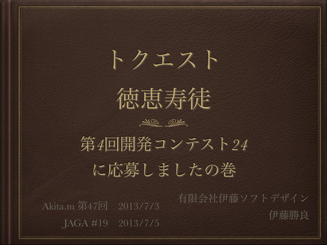 τΫΤετ ಙܙणె ୈ4ճ։ൃίϯςετ24 ʹԠื͠·ͨ͠ͷר ༗ݶձࣾҏ౻ιϑτσβΠϯ ҏ౻উྑ Akita.m ୈ47ճɹ2013/7/3 JAGA #19