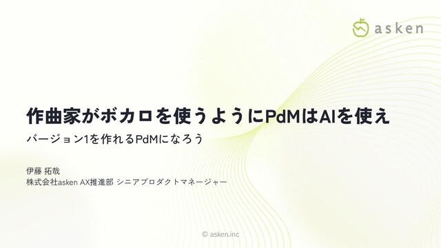 © asken.inc 作曲家がボカロを使うようにPdMはAIを使え バージョン1を作れるPdMになろう 伊藤 拓哉 株式会社asken AX推進部 シニアプロダクトマネージャー
