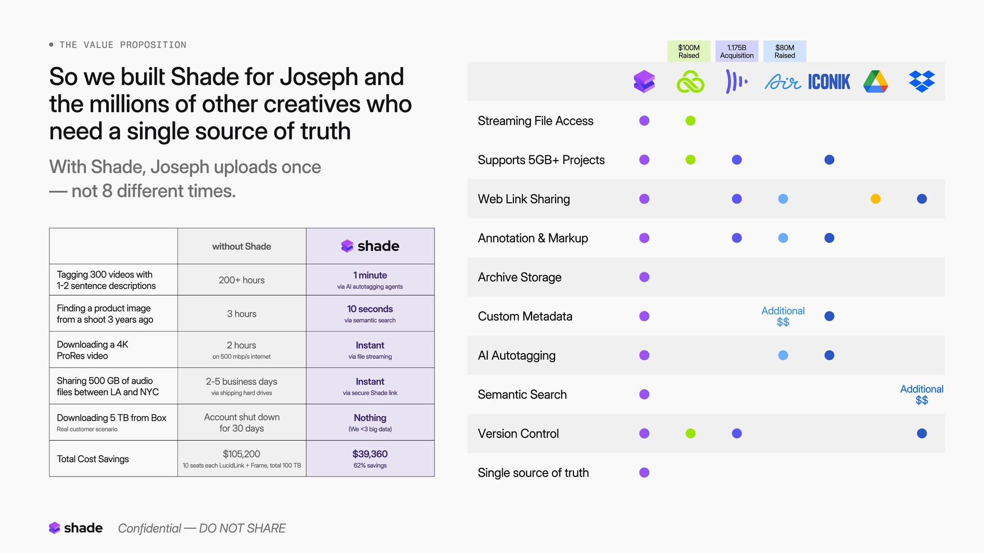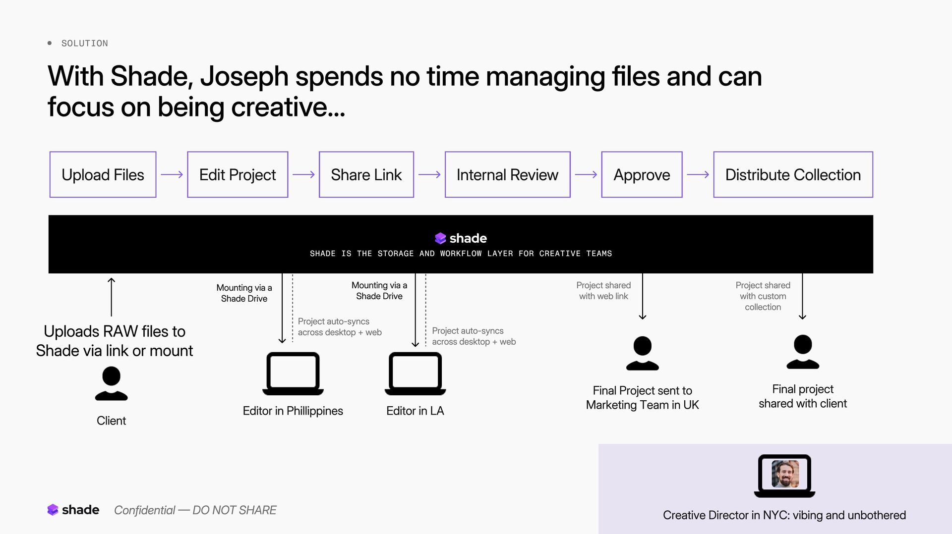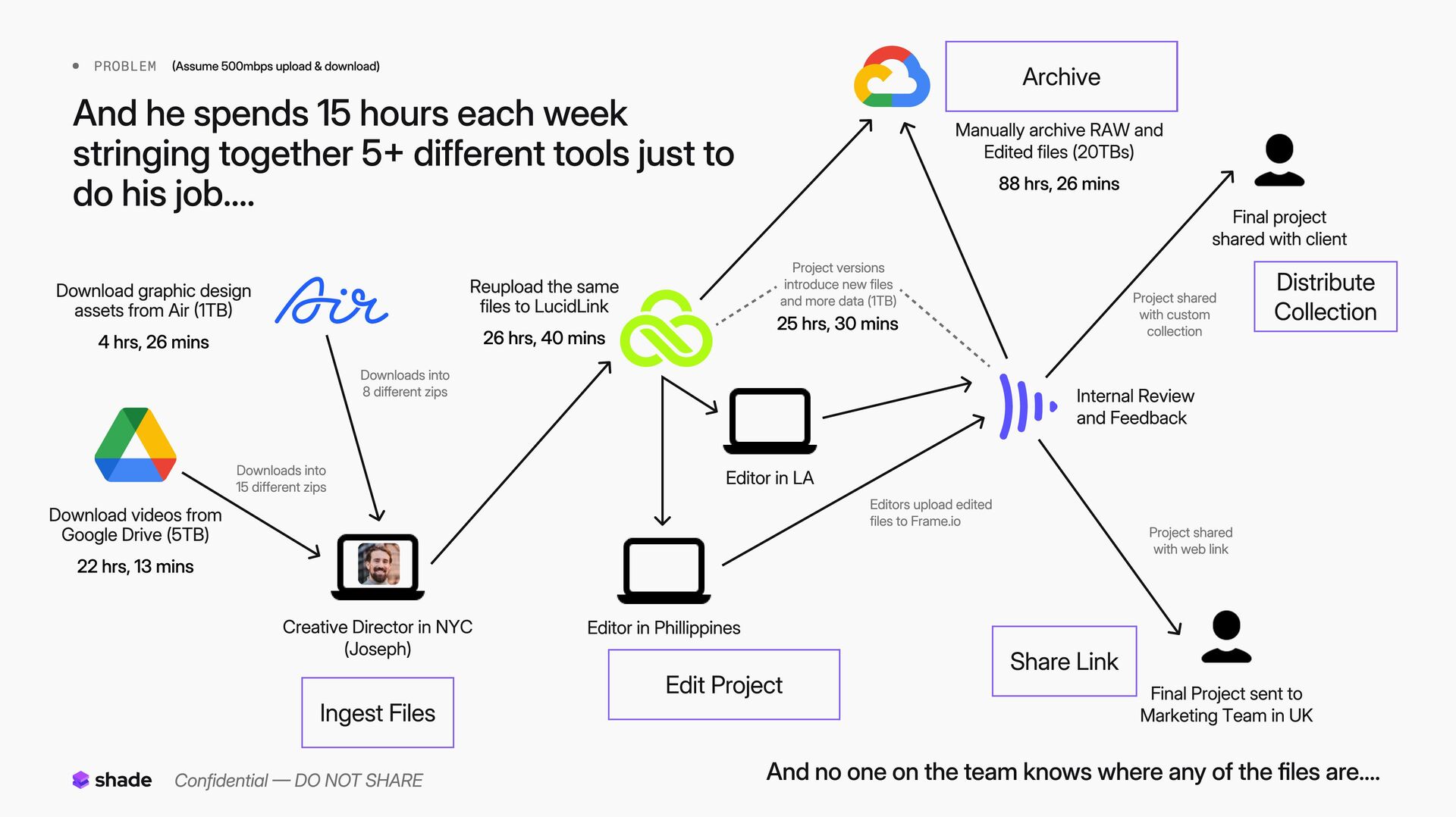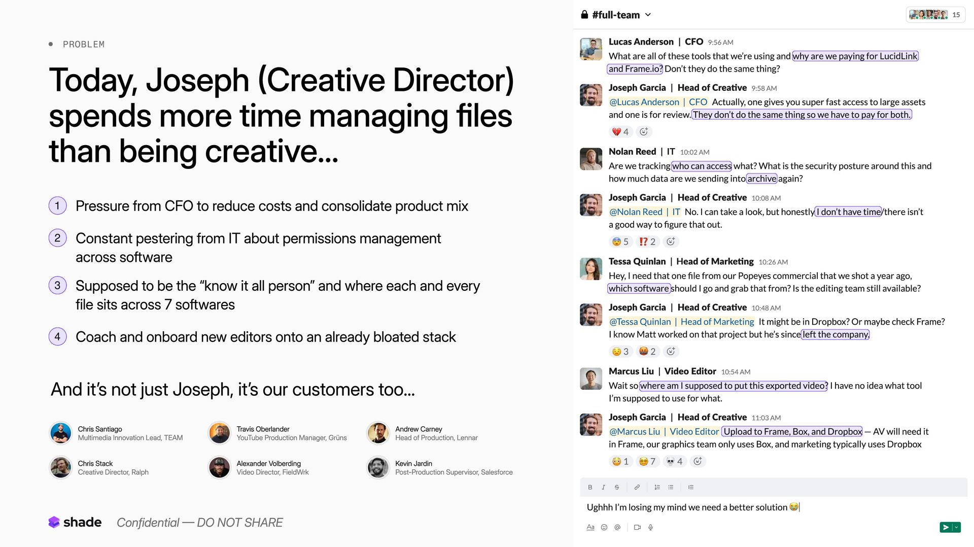 these tools that we’re using and why are we paying for LucidLink and Frame.io? Don’t they do the same thing? Joseph Garcia | Head of Creative @Lucas Anderson | CFO Actually, one gives you super fast access to large assets and one is for review. They don’t do the same thing so we have to pay for both. Nolan Reed | IT Are we tracking who can access what? What is the security posture around this and how much data are we sending into archive again? Joseph Garcia | Head of Creative @Nolan Reed | IT No. I can take a look, but honestly I don’t have time/there isn’t a good way to figure that out. Tessa Quinlan | Head of Marketing Hey, I need that one file from our Popeyes commercial that we shot a year ago, which software should I go and grab that from? Is the editing team still available? Joseph Garcia | Head of Creative @Tessa Quinlan | Head of Marketing It might be in Dropbox? Or maybe check Frame? I know Matt worked on that project but he’s since left the company. Marcus Liu | Video Editor Wait so where am I supposed to put this exported video? I have no idea what tool I’m supposed to use for what. Joseph Garcia | Head of Creative @Marcus Liu | Video Editor Upload to Frame, Box, and Dropbox — AV will need it in Frame, our graphics team only uses Box, and marketing typically uses Dropbox Ughhh I’m losing my mind we need a better solution PROBLEM Today, Joseph (Creative Director) spends more time managing files than being creative... And it’s not just Joseph, it’s our customers too... 1 Pressure from CFO to reduce costs and consolidate product mix 2 Constant pestering from IT about permissions management across software 3 Supposed to be the “know it all person” and where each and every file sits across 7 softwares 4 Coach and onboard new editors onto an already bloated stack Confidential — DO NOT SHARE Chris Santiago Multimedia Innovation Lead, TEAM Travis Oberlander YouTube Production Manager, Grüns Andrew Carney Head of Production, Lennar Chris Stack Creative Director, Ralph Alexander Volberding Video Director, FieldWrk Kevin Jardin Post-Production Supervisor, Salesforce