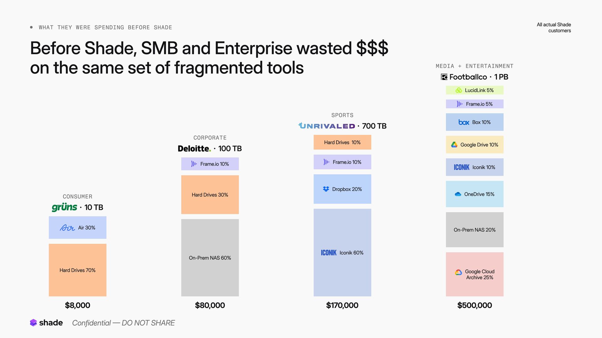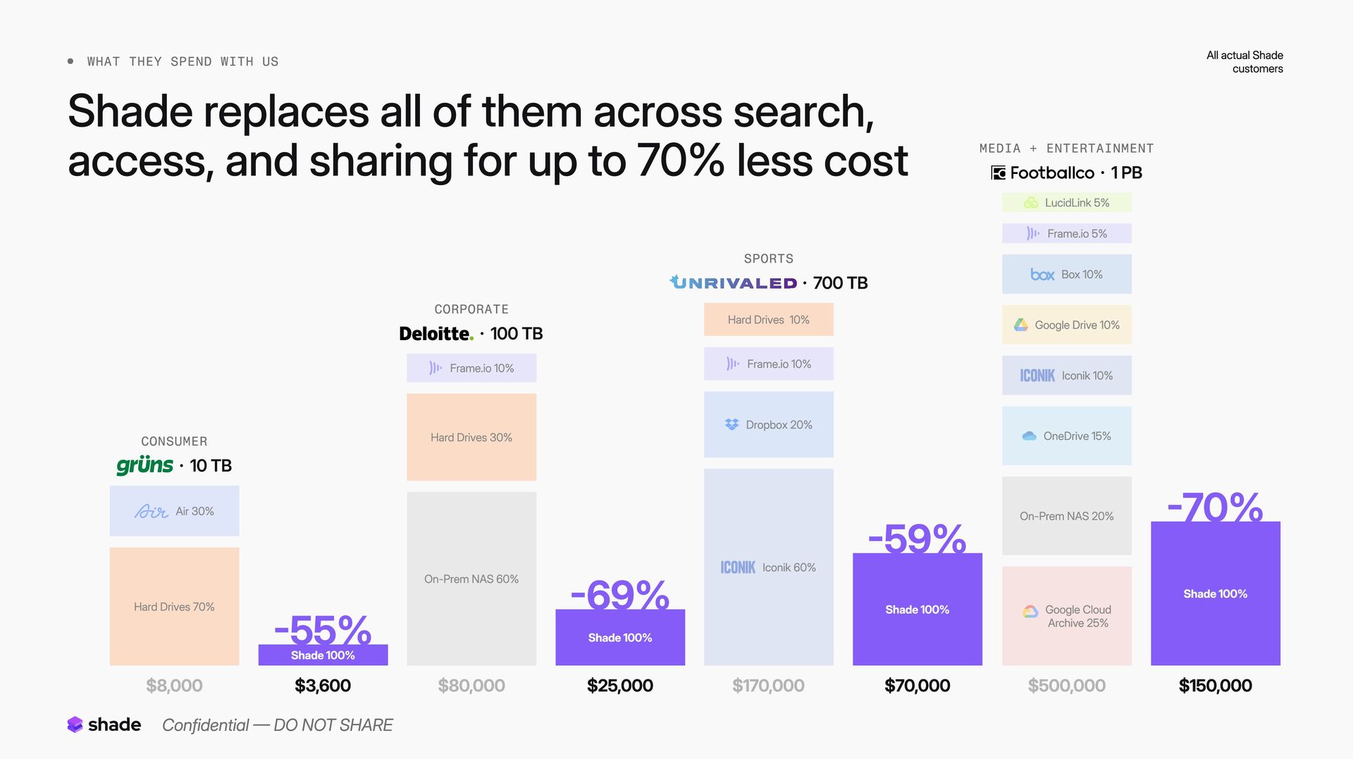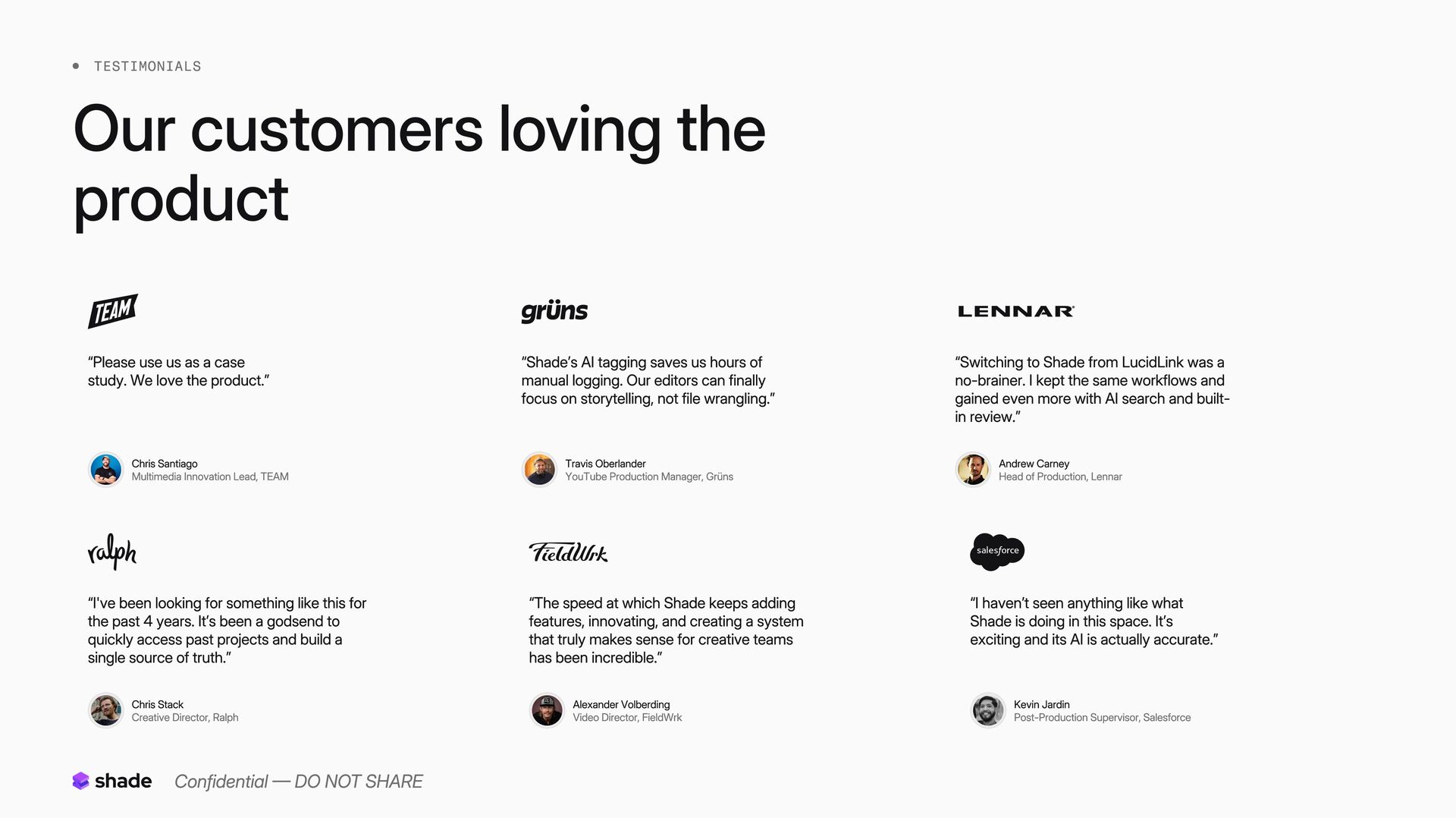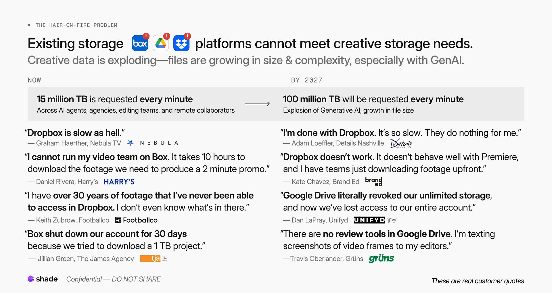 these tools that we’re using and why are we paying for LucidLink and Frame.io? Don’t they do the same thing? Joseph Garcia | Head of Creative @Lucas Anderson | CFO Actually, one gives you super fast access to large assets and one is for review. They don’t do the same thing so we have to pay for both. Nolan Reed | IT Are we tracking who can access what? What is the security posture around this and how much data are we sending into archive again? Joseph Garcia | Head of Creative @Nolan Reed | IT No. I can take a look, but honestly I don’t have time/there isn’t a good way to figure that out. Tessa Quinlan | Head of Marketing Hey, I need that one file from our Popeyes commercial that we shot a year ago, which software should I go and grab that from? Is the editing team still available? Joseph Garcia | Head of Creative @Tessa Quinlan | Head of Marketing It might be in Dropbox? Or maybe check Frame? I know Matt worked on that project but he’s since left the company. Marcus Liu | Video Editor Wait so where am I supposed to put this exported video? I have no idea what tool I’m supposed to use for what. Joseph Garcia | Head of Creative @Marcus Liu | Video Editor Upload to Frame, Box, and Dropbox — AV will need it in Frame, our graphics team only uses Box, and marketing typically uses Dropbox Ughhh I’m losing my mind we need a better solution PROBLEM Today, Joseph (Creative Director) spends more time managing files than being creative... And it’s not just Joseph, it’s our customers too... 1 Pressure from CFO to reduce costs and consolidate product mix 2 Constant pestering from IT about permissions management across software 3 Supposed to be the “know it all person” and where each and every file sits across 7 softwares 4 Coach and onboard new editors onto an already bloated stack Confidential — DO NOT SHARE Chris Santiago Multimedia Innovation Lead, TEAM Travis Oberlander YouTube Production Manager, Grüns Andrew Carney Head of Production, Lennar Chris Stack Creative Director, Ralph Alexander Volberding Video Director, FieldWrk Kevin Jardin Post-Production Supervisor, Salesforce