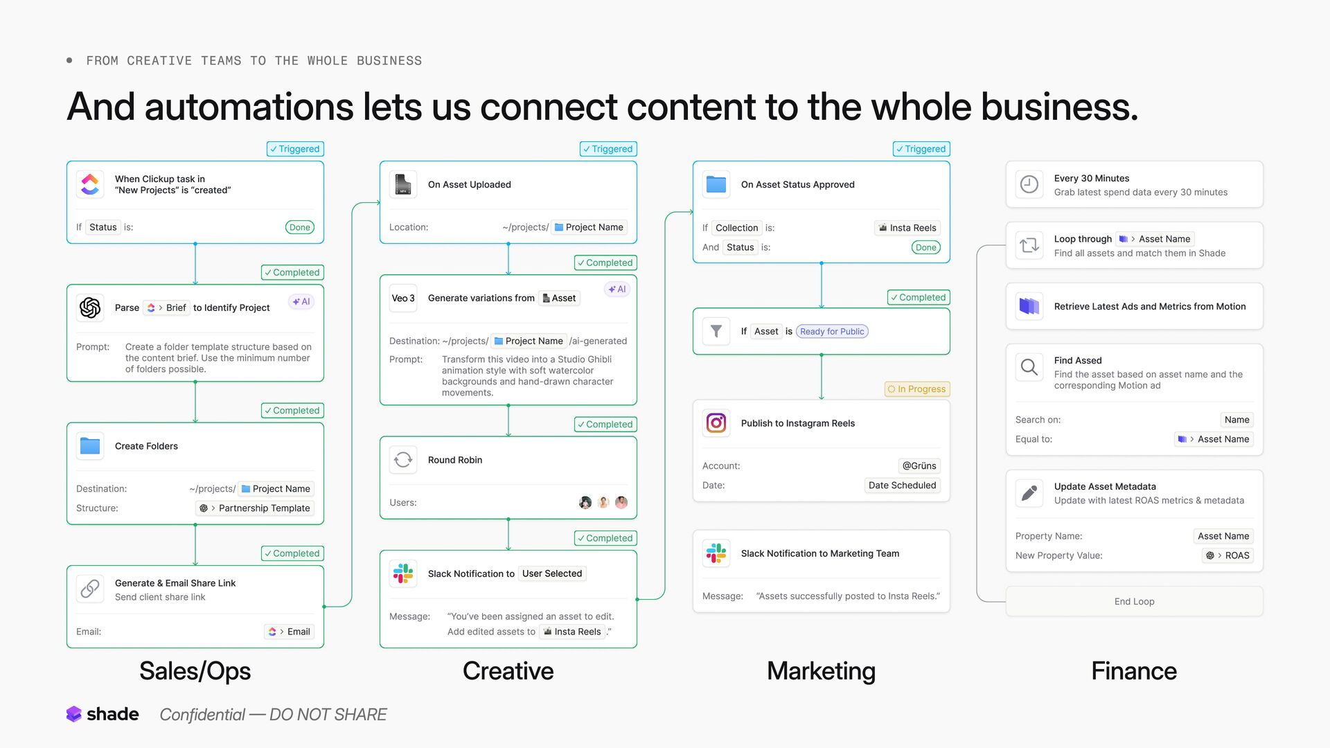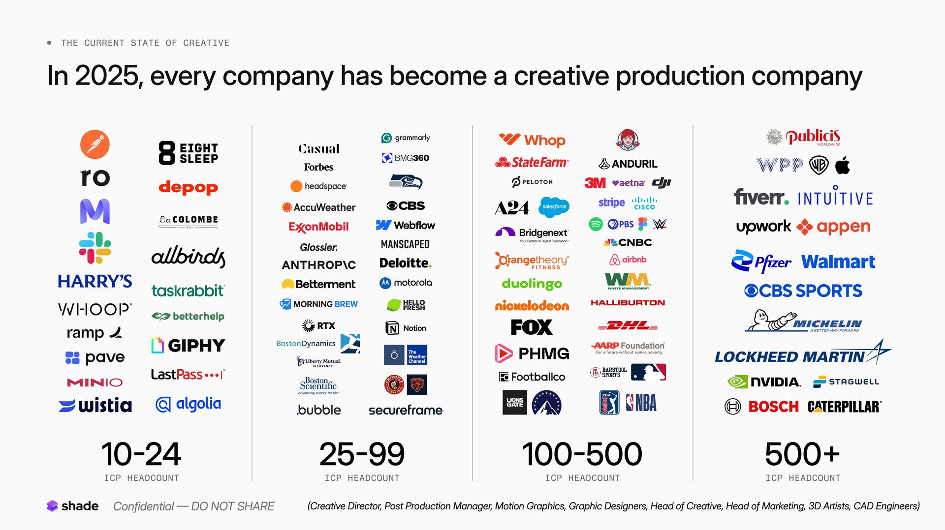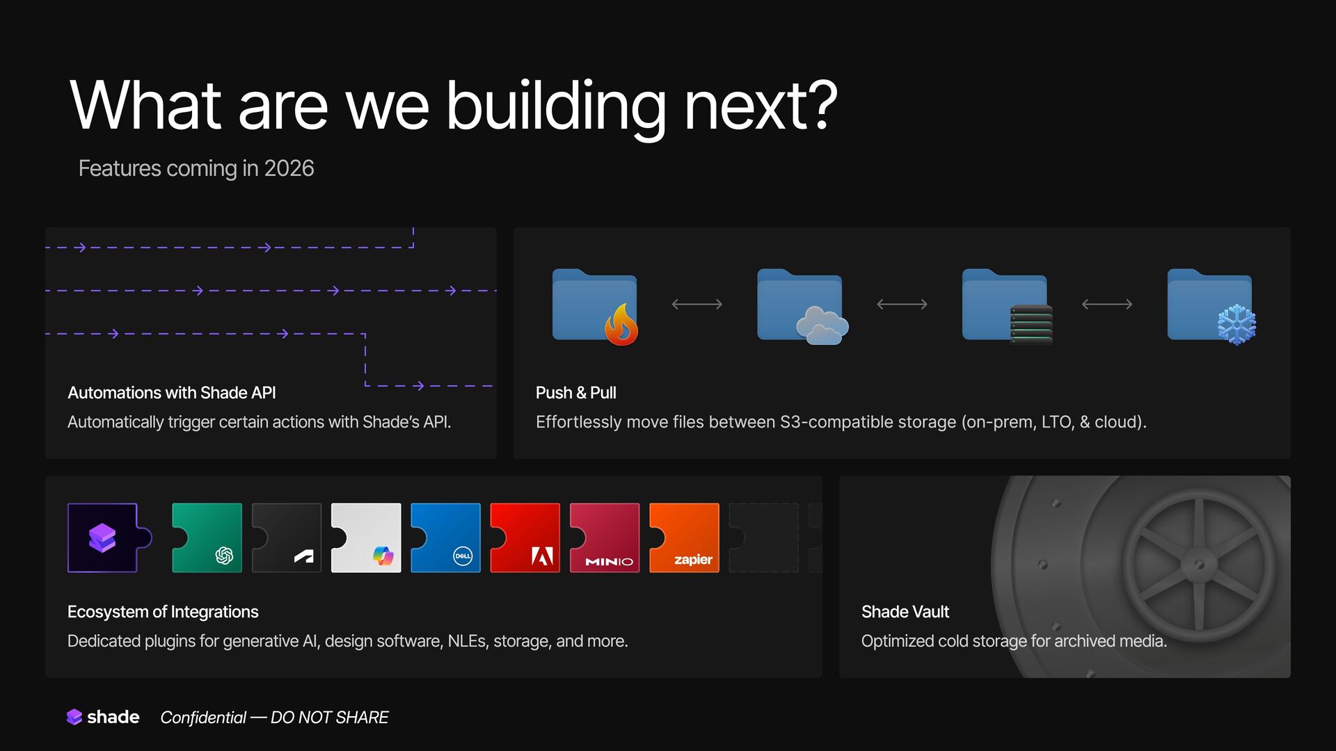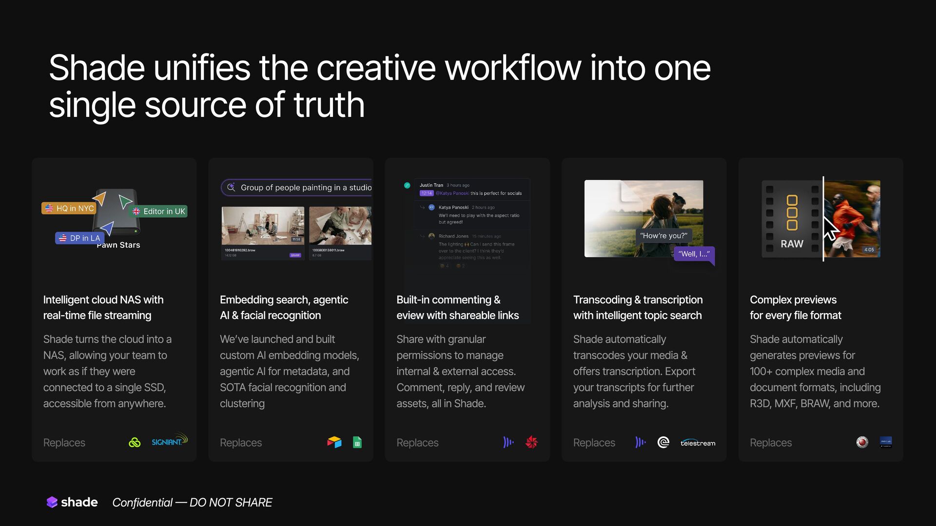 these tools that we’re using and why are we paying for LucidLink and Frame.io? Don’t they do the same thing? Joseph Garcia | Head of Creative @Lucas Anderson | CFO Actually, one gives you super fast access to large assets and one is for review. They don’t do the same thing so we have to pay for both. Nolan Reed | IT Are we tracking who can access what? What is the security posture around this and how much data are we sending into archive again? Joseph Garcia | Head of Creative @Nolan Reed | IT No. I can take a look, but honestly I don’t have time/there isn’t a good way to figure that out. Tessa Quinlan | Head of Marketing Hey, I need that one file from our Popeyes commercial that we shot a year ago, which software should I go and grab that from? Is the editing team still available? Joseph Garcia | Head of Creative @Tessa Quinlan | Head of Marketing It might be in Dropbox? Or maybe check Frame? I know Matt worked on that project but he’s since left the company. Marcus Liu | Video Editor Wait so where am I supposed to put this exported video? I have no idea what tool I’m supposed to use for what. Joseph Garcia | Head of Creative @Marcus Liu | Video Editor Upload to Frame, Box, and Dropbox — AV will need it in Frame, our graphics team only uses Box, and marketing typically uses Dropbox Ughhh I’m losing my mind we need a better solution PROBLEM Today, Joseph (Creative Director) spends more time managing files than being creative... And it’s not just Joseph, it’s our customers too... 1 Pressure from CFO to reduce costs and consolidate product mix 2 Constant pestering from IT about permissions management across software 3 Supposed to be the “know it all person” and where each and every file sits across 7 softwares 4 Coach and onboard new editors onto an already bloated stack Confidential — DO NOT SHARE Chris Santiago Multimedia Innovation Lead, TEAM Travis Oberlander YouTube Production Manager, Grüns Andrew Carney Head of Production, Lennar Chris Stack Creative Director, Ralph Alexander Volberding Video Director, FieldWrk Kevin Jardin Post-Production Supervisor, Salesforce