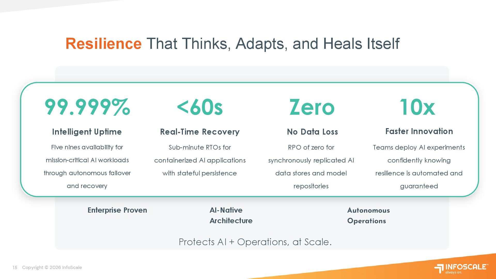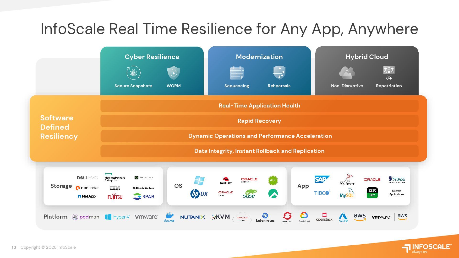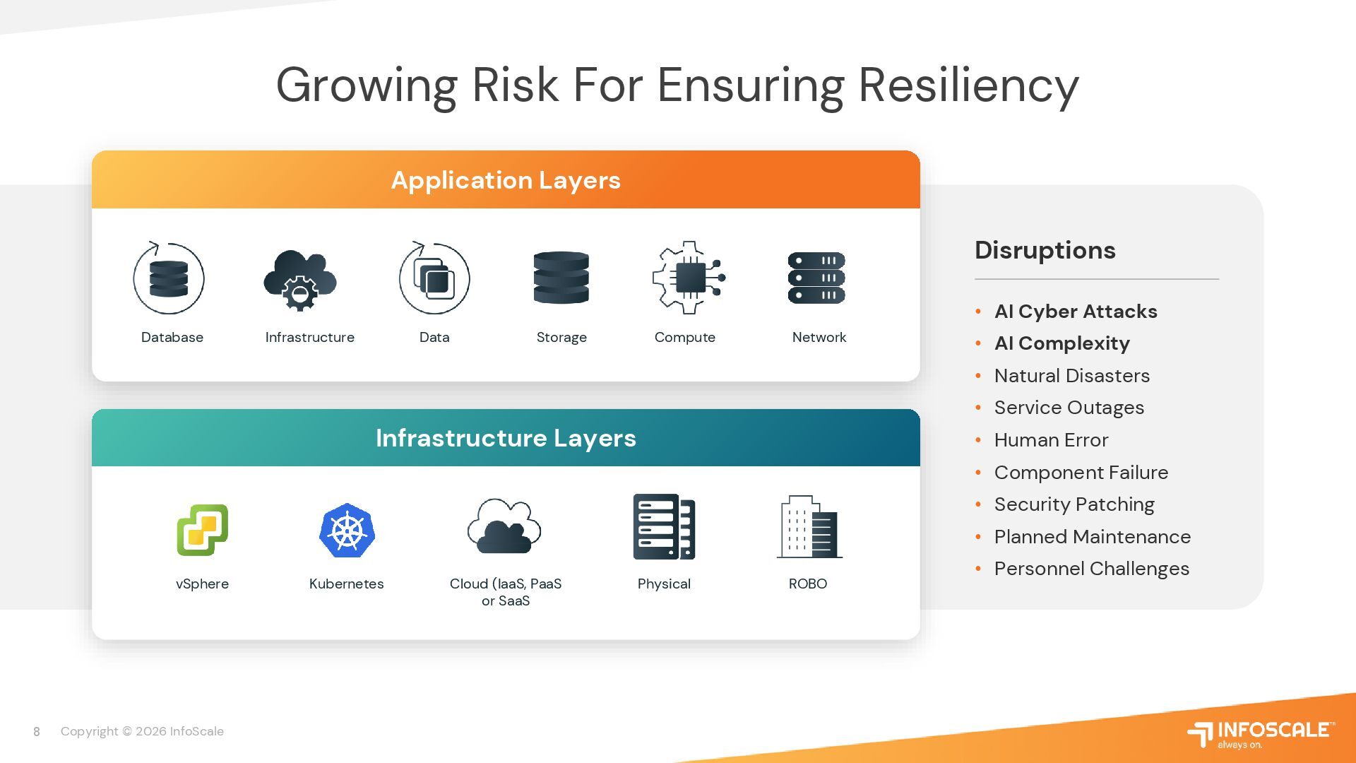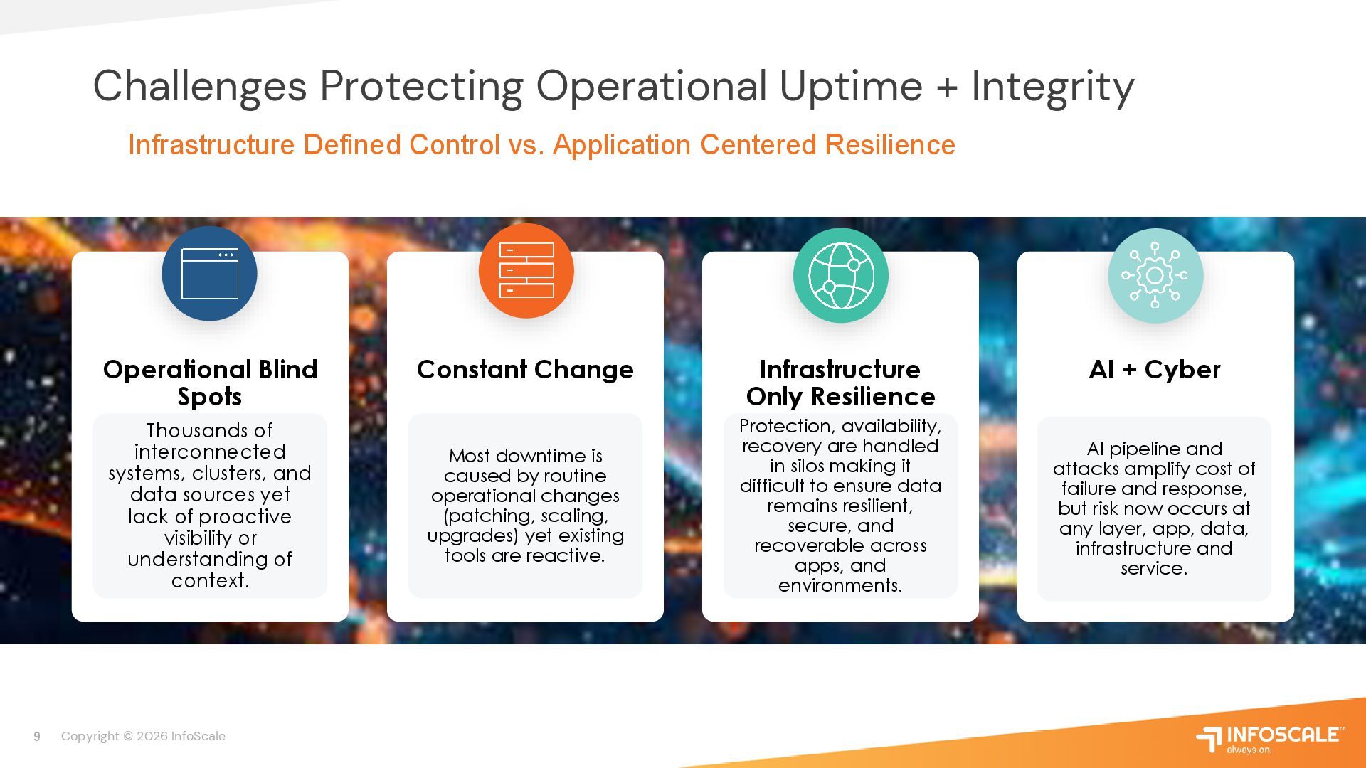 Integrity Operational Blind Spots Thousands of interconnected systems, clusters, and data sources yet lack of proactive visibility or understanding of context. Most downtime is caused by routine operational changes (patching, scaling, upgrades) yet existing tools are reactive. Constant Change Protection, availability, recovery are handled in silos making it difficult to ensure data remains resilient, secure, and recoverable across apps, and environments. Infrastructure Only Resilience AI pipeline and attacks amplify cost of failure and response, but risk now occurs at any layer, app, data, infrastructure and service. AI + Cyber Infrastructure Defined Control vs. Application Centered Resilience