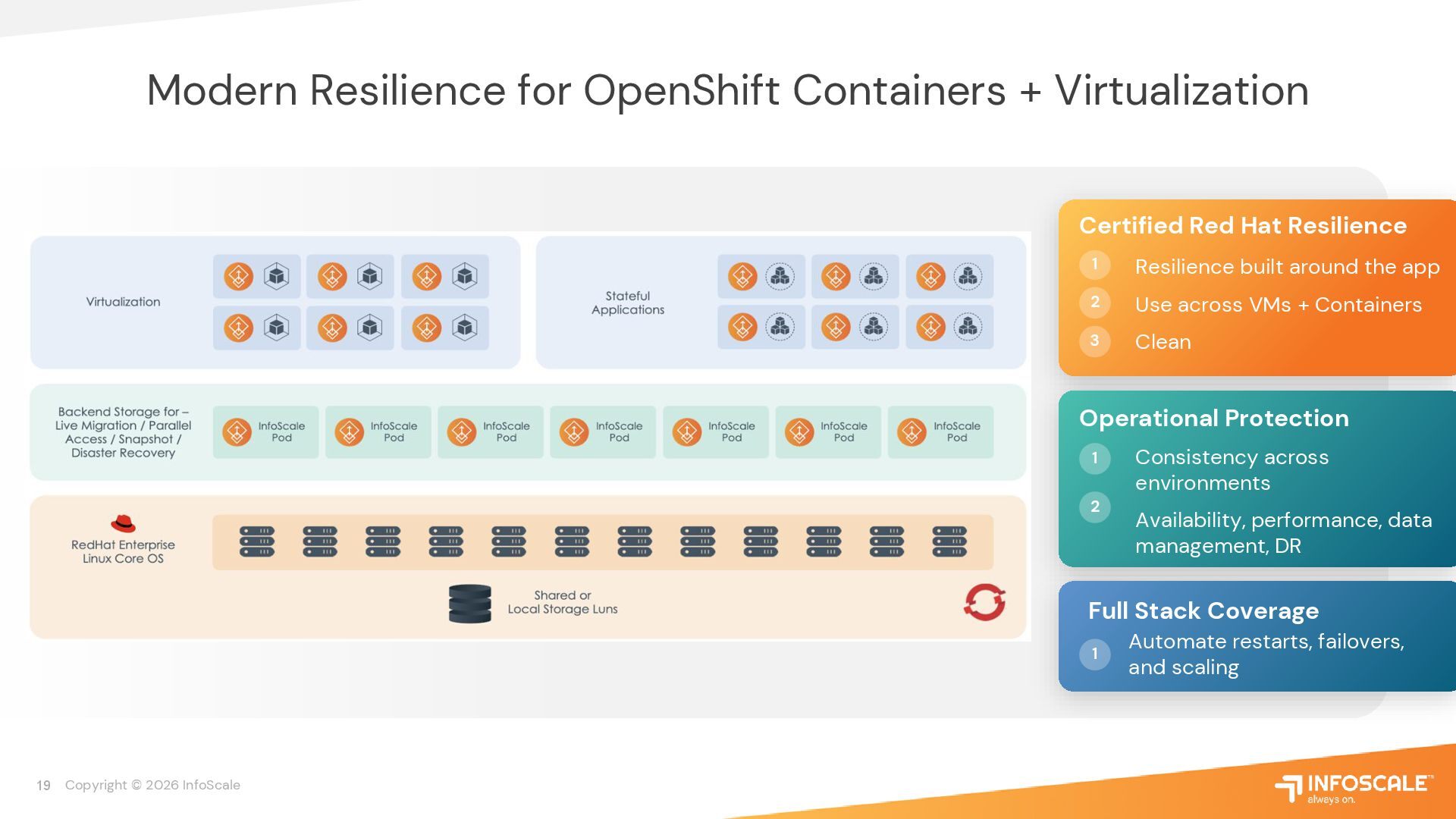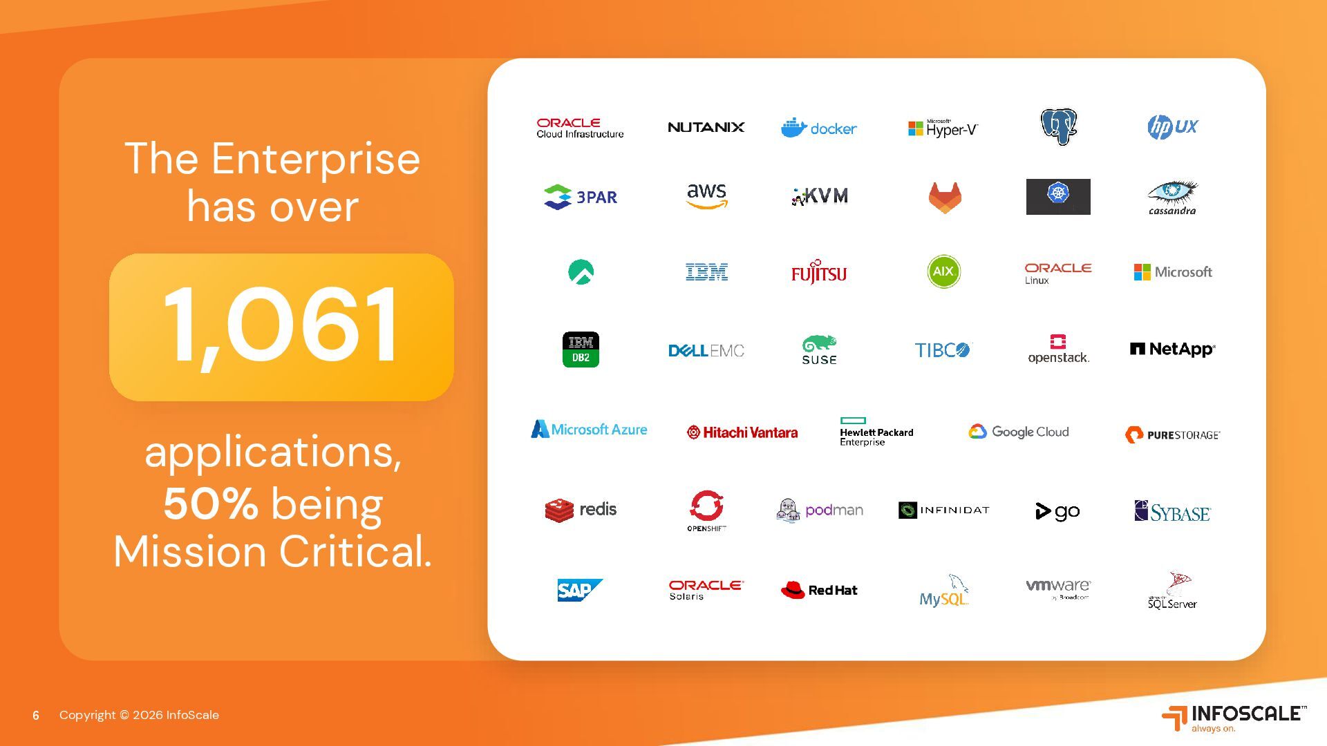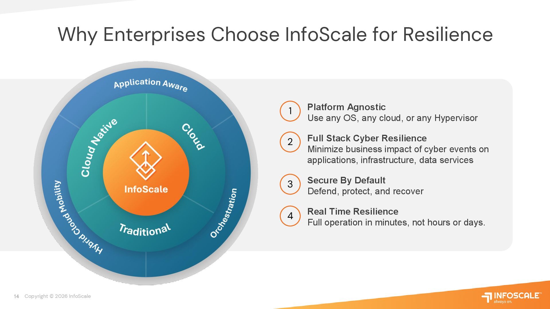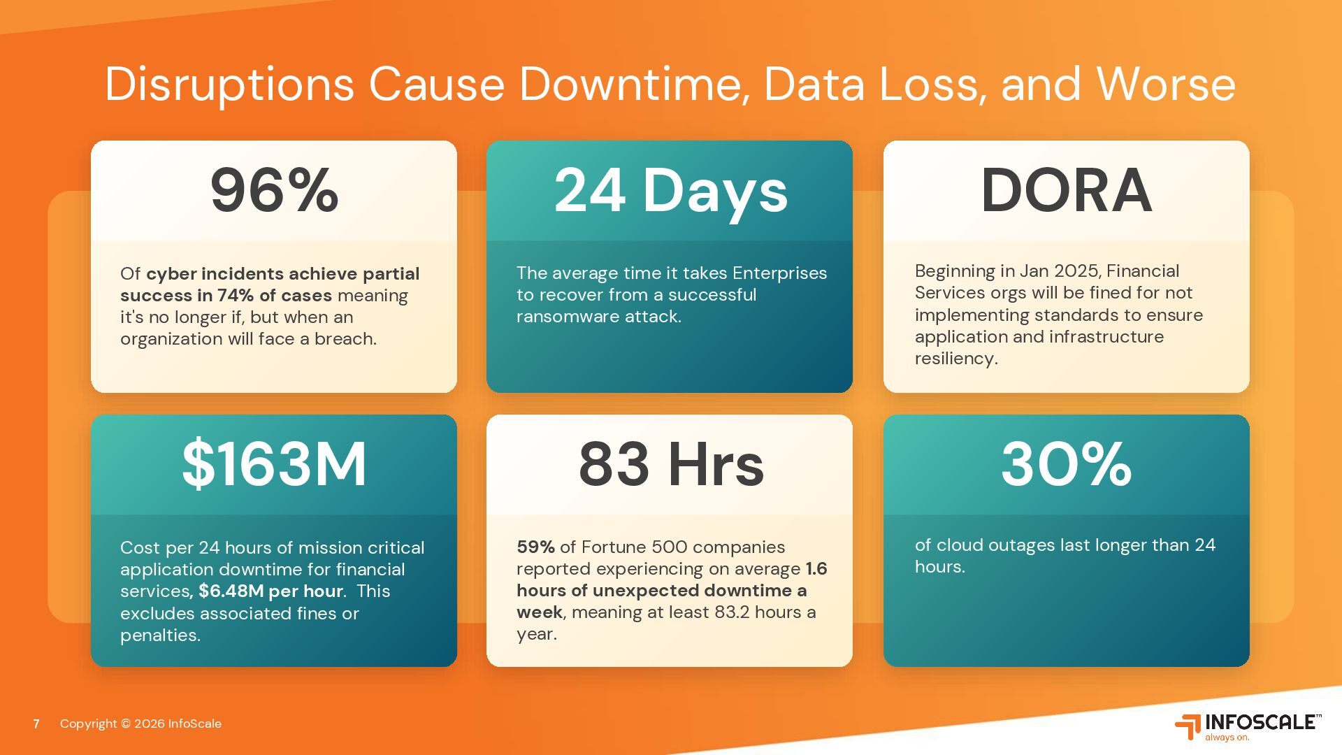 Integrity Operational Blind Spots Thousands of interconnected systems, clusters, and data sources yet lack of proactive visibility or understanding of context. Most downtime is caused by routine operational changes (patching, scaling, upgrades) yet existing tools are reactive. Constant Change Protection, availability, recovery are handled in silos making it difficult to ensure data remains resilient, secure, and recoverable across apps, and environments. Infrastructure Only Resilience AI pipeline and attacks amplify cost of failure and response, but risk now occurs at any layer, app, data, infrastructure and service. AI + Cyber Infrastructure Defined Control vs. Application Centered Resilience