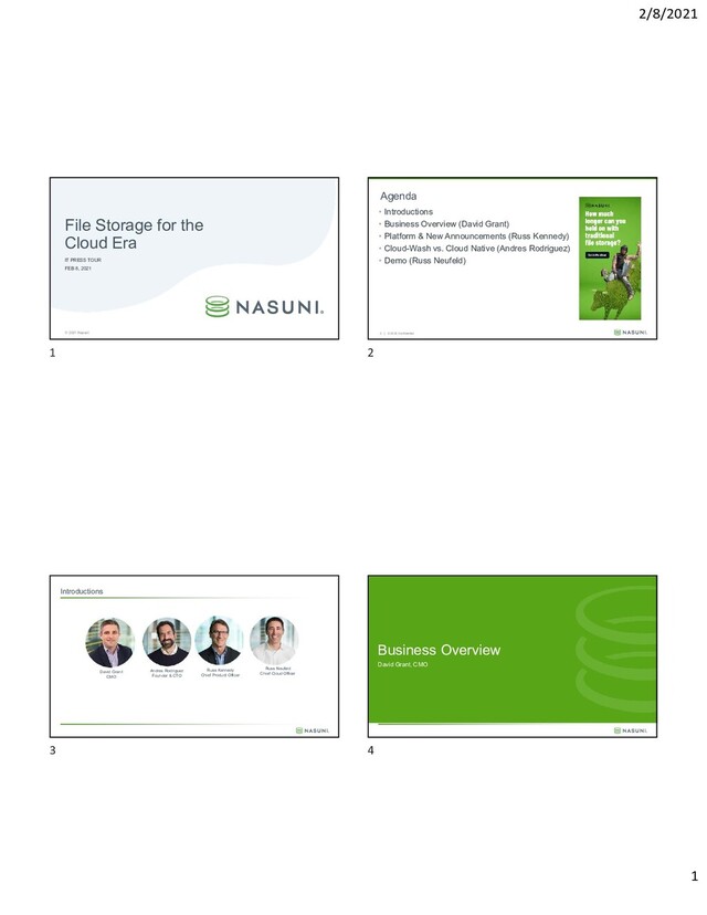 Nasuni Partners From DCIG Analyst Report, “Nasuni vs. NetApp for Next-Gen Cloud File Storage Infrastructure” Nasuni NetApp Storage capacity in cloud native storage Unlimited 0.368 PB File locking Global, Distributed, Cloud-native One ONTAP instance per cluster Core Storage technology Object Block File size (maximum) Unlimited 16 TB Files per volume (maximum) Unlimited 2 Billion Volume size (maximum) Unlimited 100 TB Directory size (maximum) Unlimited 320 MB Directories (max) Unlimited 100,000 Files per Name Space Unlimited 400 Billion Capacity per Name Space Unlimited 100 TB (Cloud Volumes ONTAP) Nasuni vs. NetApp Comparison 30 | © 2021 Confidential to Nasuni and Nasuni Partners “Apples to Apples” - Cost/TB/Year ($USD) $550* $800 Includes Nasuni, Nasuni Edge Appliances, Object Storage Includes Azure Files, Snapshots, Azure Backup, Azure File Sync, Windows File Servers Includes Azure NetApp Files Primary and DR Instances, Snapshots, NetApp Cloud Backup, NetApp Global File Cache, Windows Servers TB/Y TB/Y Cost Comparison $3200 TB/Y Azure Files Azure NetApp Files Nasuni Includes NetApp Cloud Volumes ONTAP Primary and DR Instances, FabricPool Tiering to Azure Blob, NetApp Cloud Backup, NetApp Global File Cache, Windows Servers $2000 TB/Y NetApp Cloud Volumes ONTAP *Minimum Purchase Required 31 | © 2021 Nasuni Corporation - Confidential #1: Consolidation with Remote SMB3 Edge Appliances deployed in large office, data center, or cloud region . . . • Nearby sites use SMB3 for remote access • Fewer volume connections, less contention Orchestration Center • Distant sites maintain local Edge Appliances for fast access Globally Accessible Shared Volumes SMB3 Data Nasuni Cloud SMB3 Local Cloud Region Local Cloud Region 32 | © 2021 Nasuni Corporation - Confidential #2: Consolidation with VDI Edge Appliances deployed in data center or cloud region near virtual desktops . . . Orchestration Center Globally Accessible Shared Volumes VDI Access Nasuni Cloud VDI VDI Local Cloud Region Local Cloud Region • Nearby sites use VDI for remote access • Fewer volume connections, less contention • Distant sites maintain local Edge Appliances for fast access 29 30 31 32