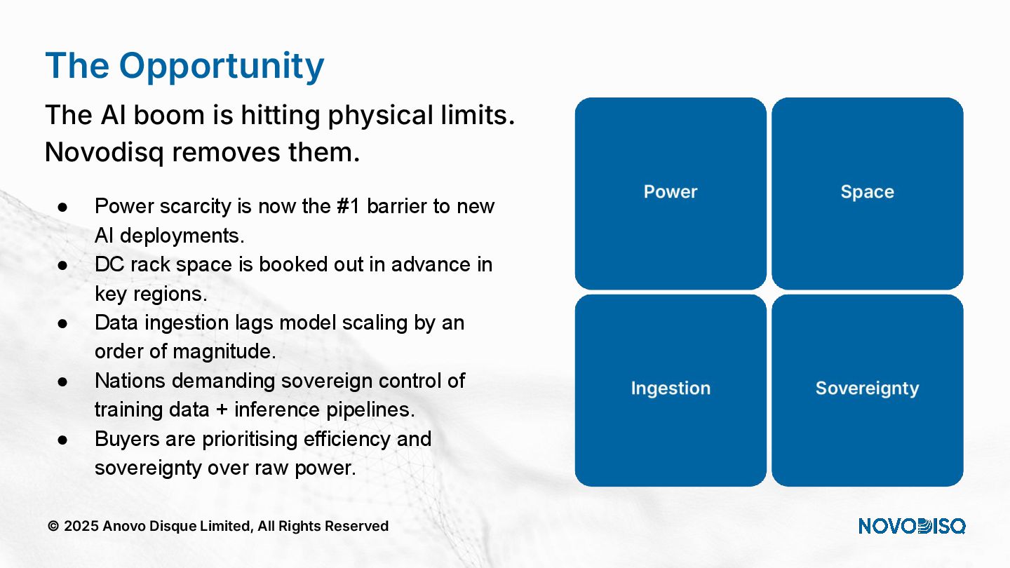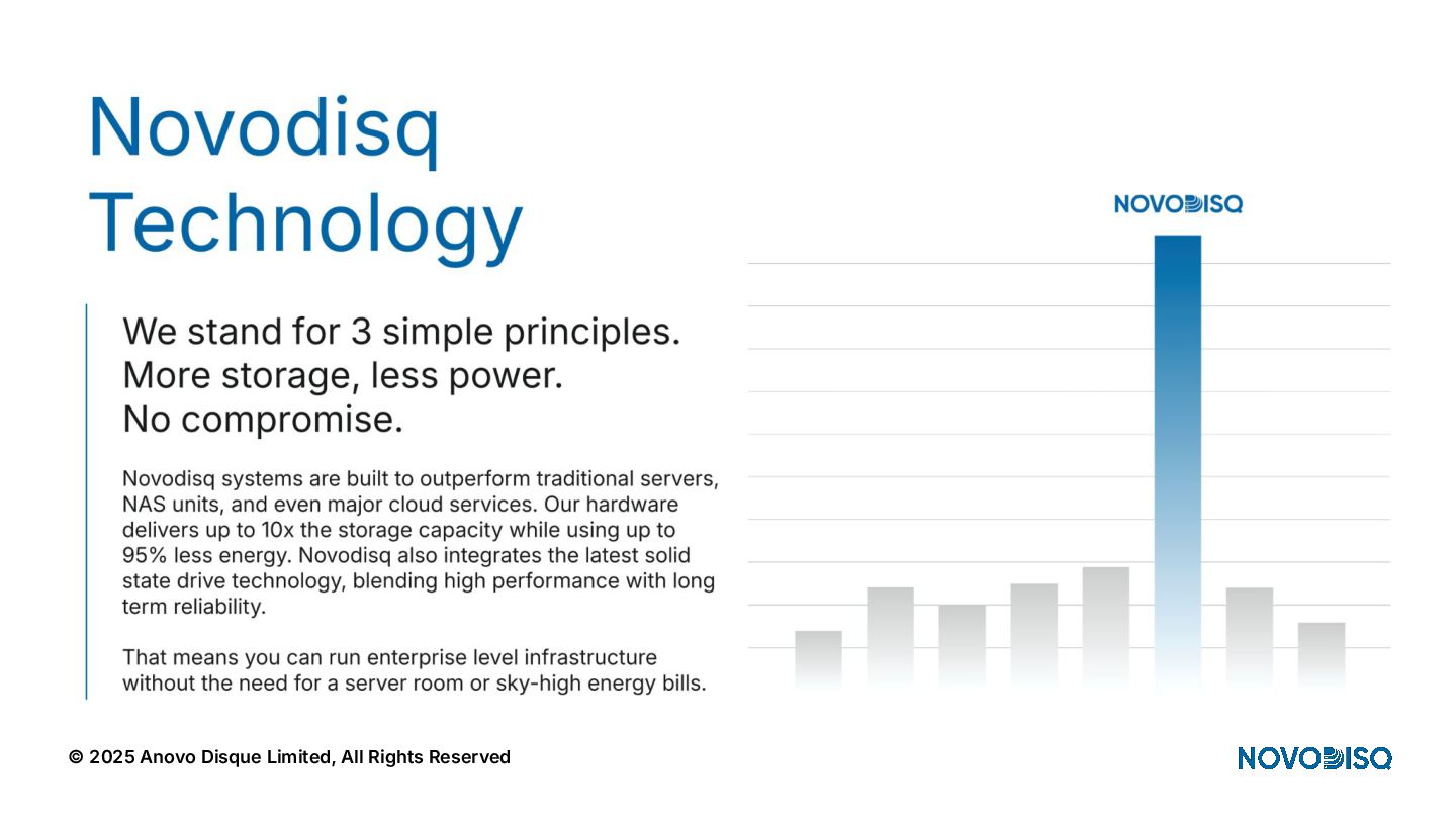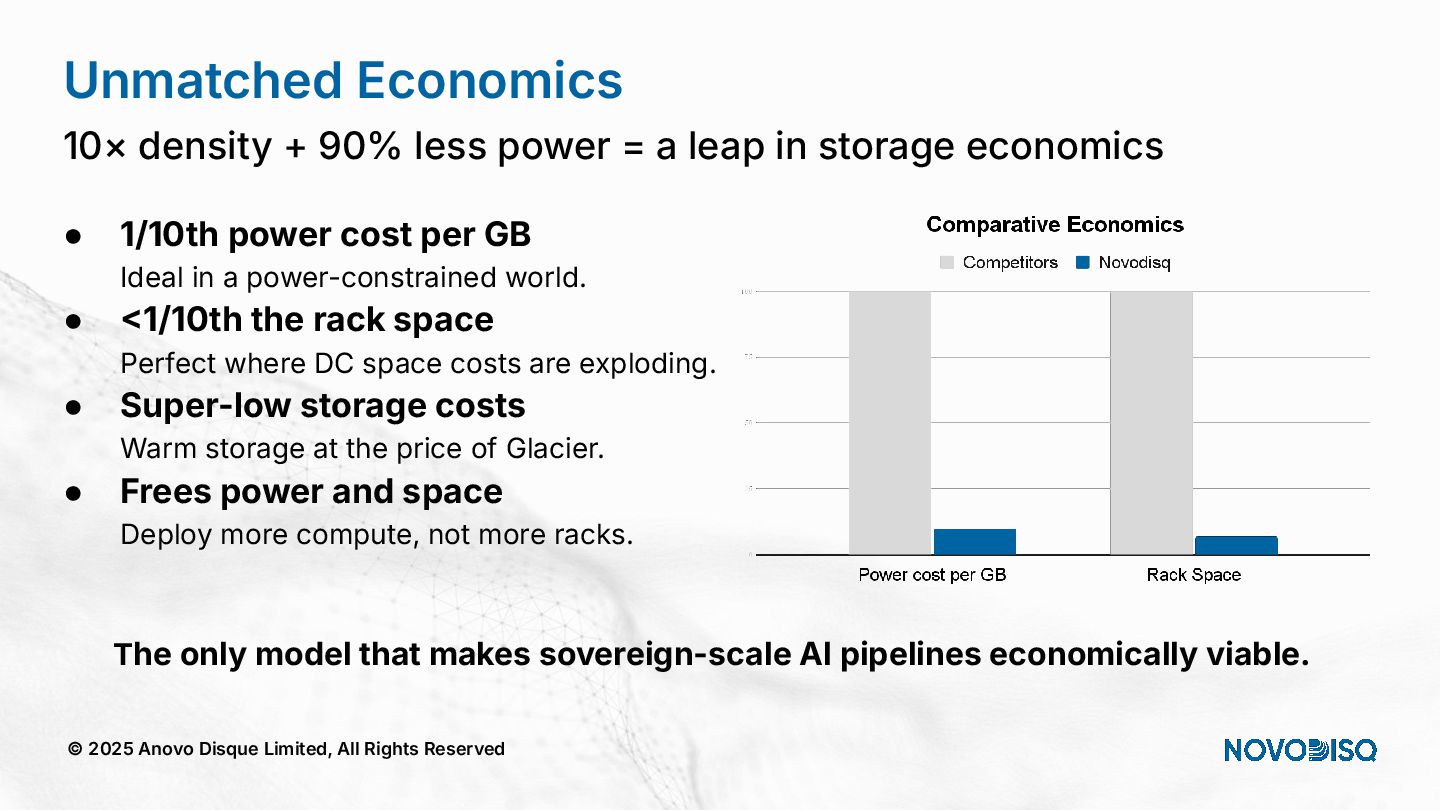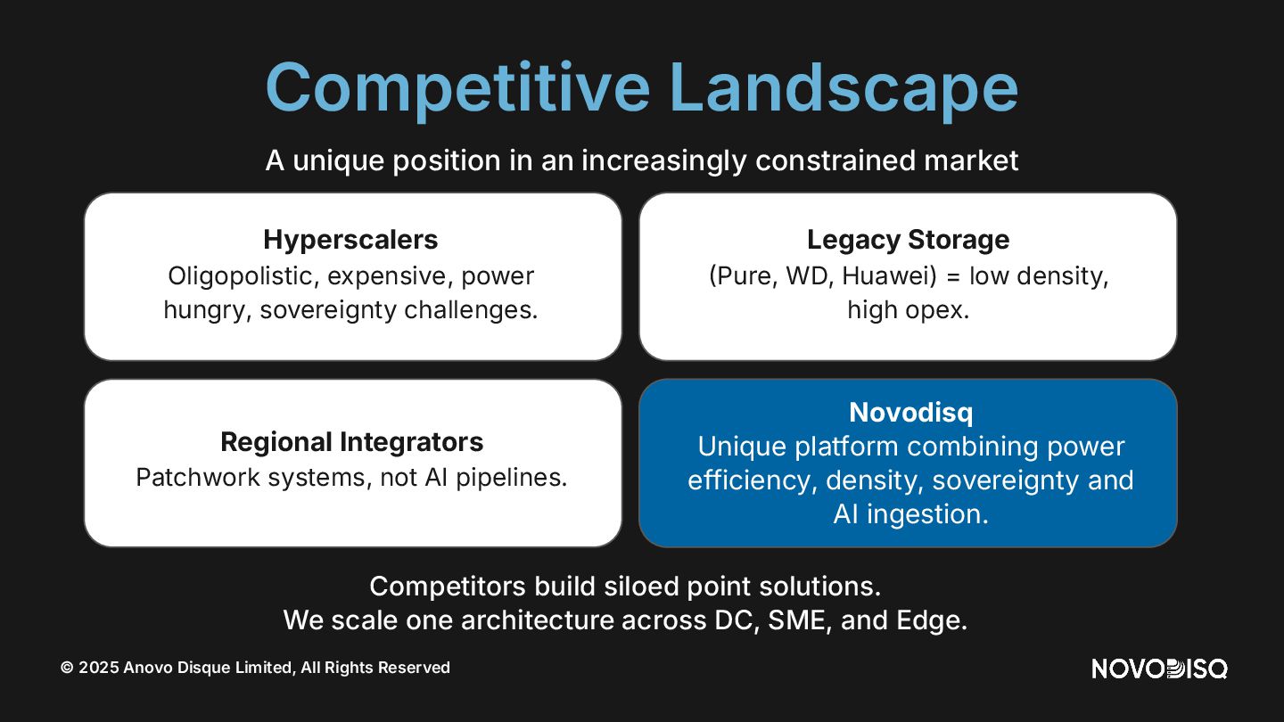 architecture across DC, SME, and Edge. © 2025 Anovo Disque Limited, All Rights Reserved A unique position in an increasingly constrained market Hyperscalers Oligopolistic, expensive, power hungry, sovereignty challenges. Legacy Storage Pure, WD, Huawei) = low density, high opex. Regional Integrators Patchwork systems, not AI pipelines. Novodisq Unique platform combining power efficiency, density, sovereignty and AI ingestion.