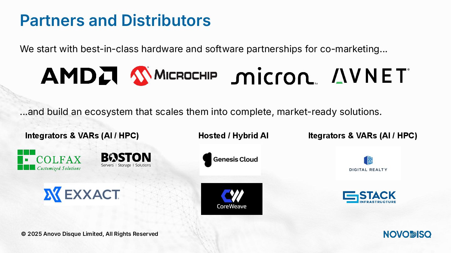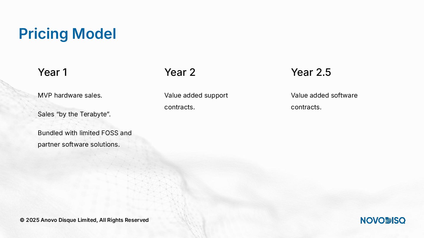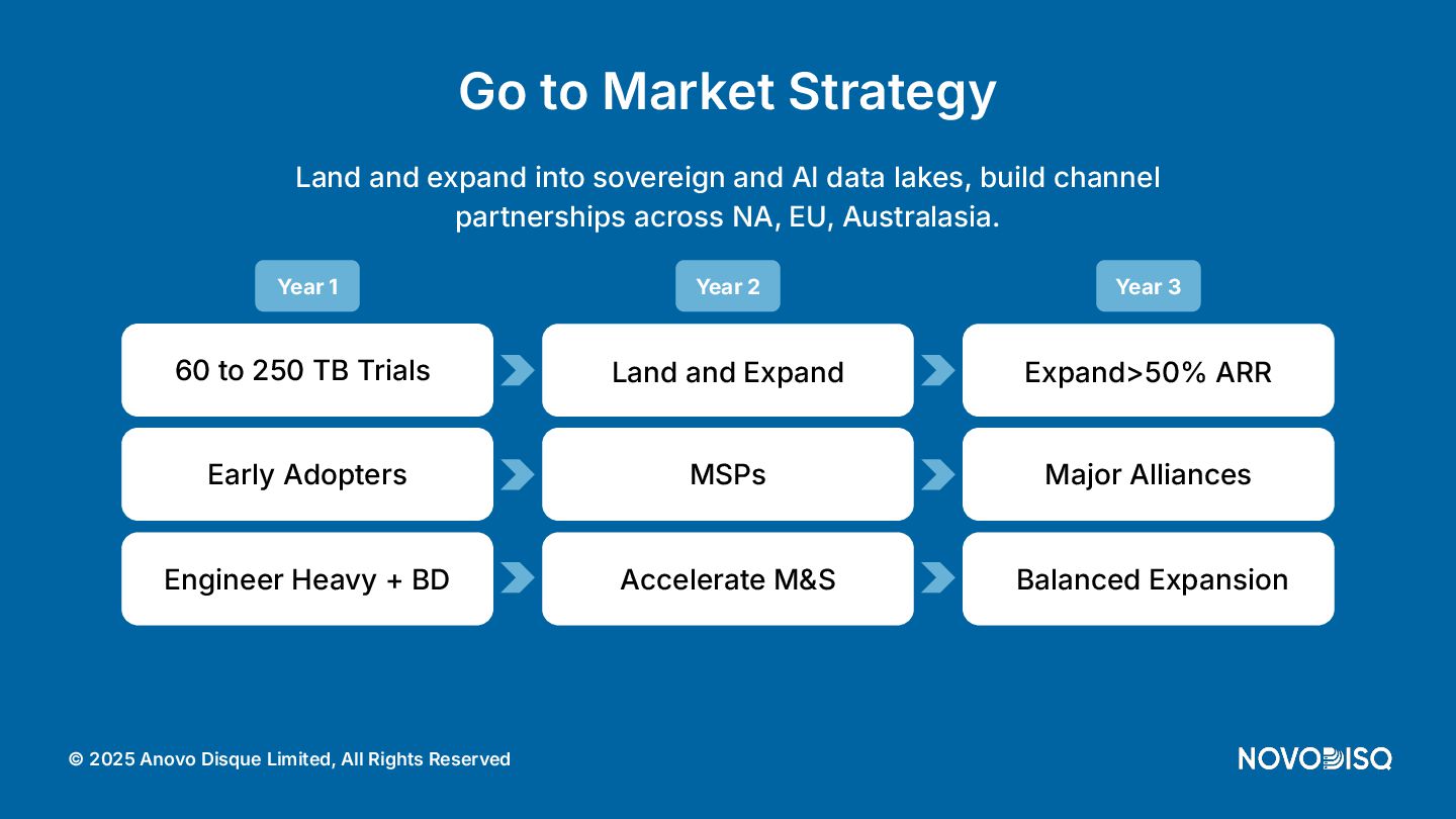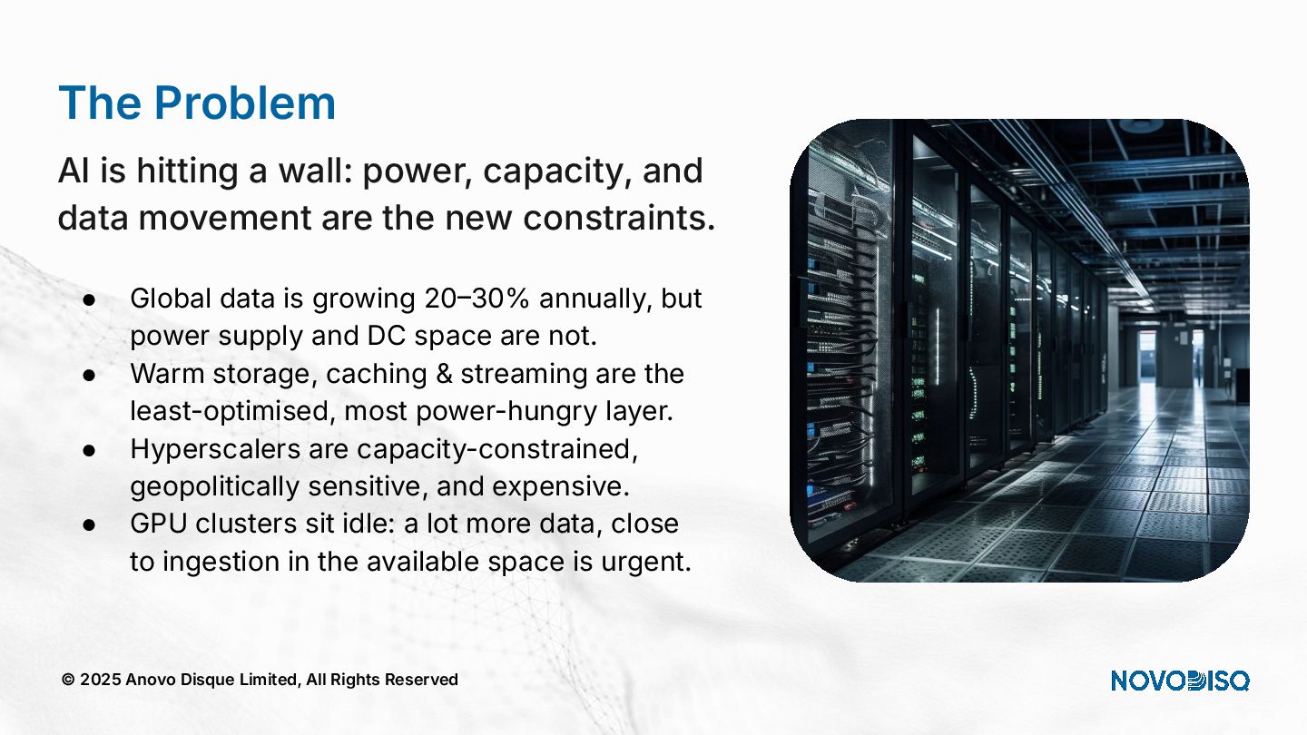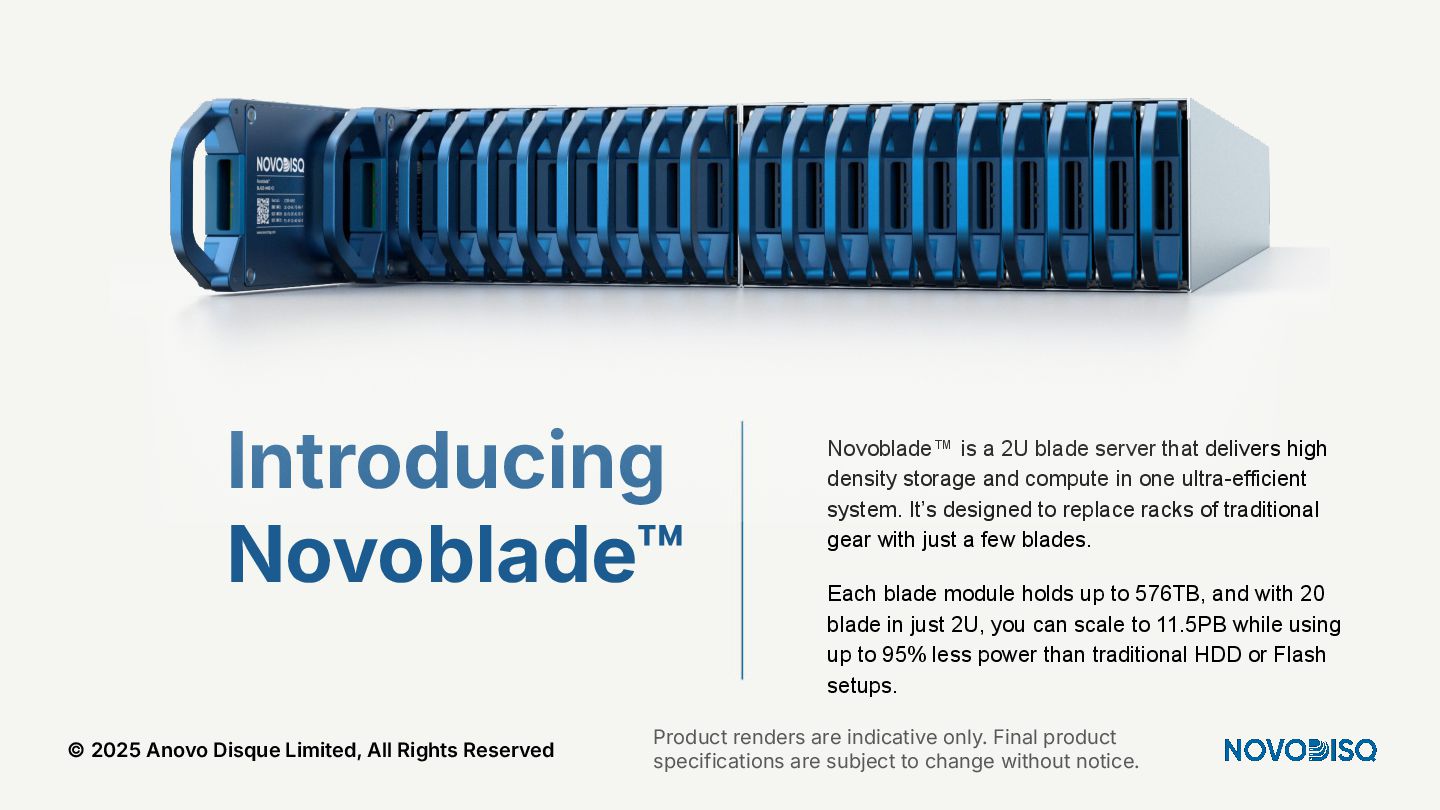 architecture across DC, SME, and Edge. © 2025 Anovo Disque Limited, All Rights Reserved A unique position in an increasingly constrained market Hyperscalers Oligopolistic, expensive, power hungry, sovereignty challenges. Legacy Storage Pure, WD, Huawei) = low density, high opex. Regional Integrators Patchwork systems, not AI pipelines. Novodisq Unique platform combining power efficiency, density, sovereignty and AI ingestion.