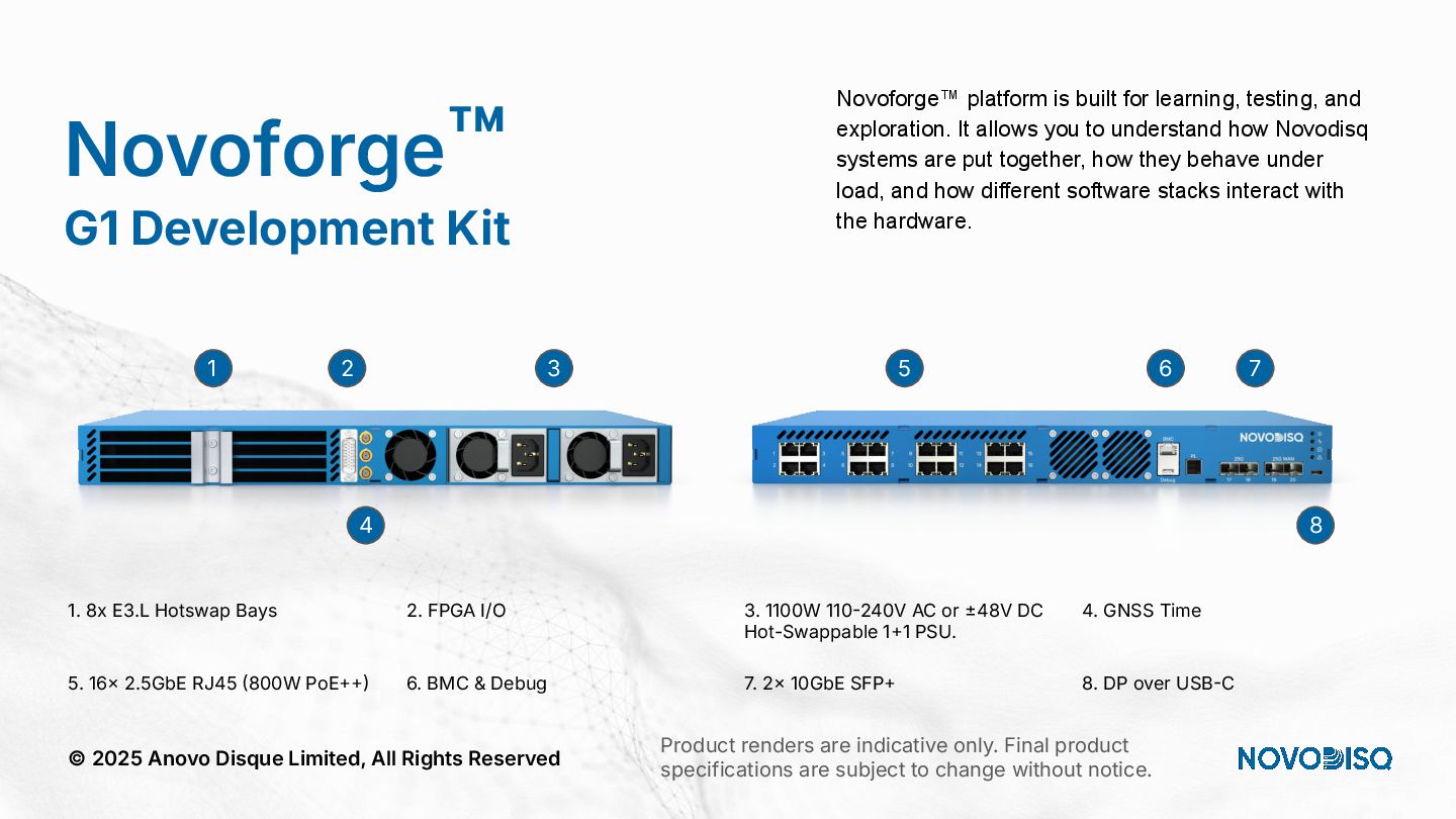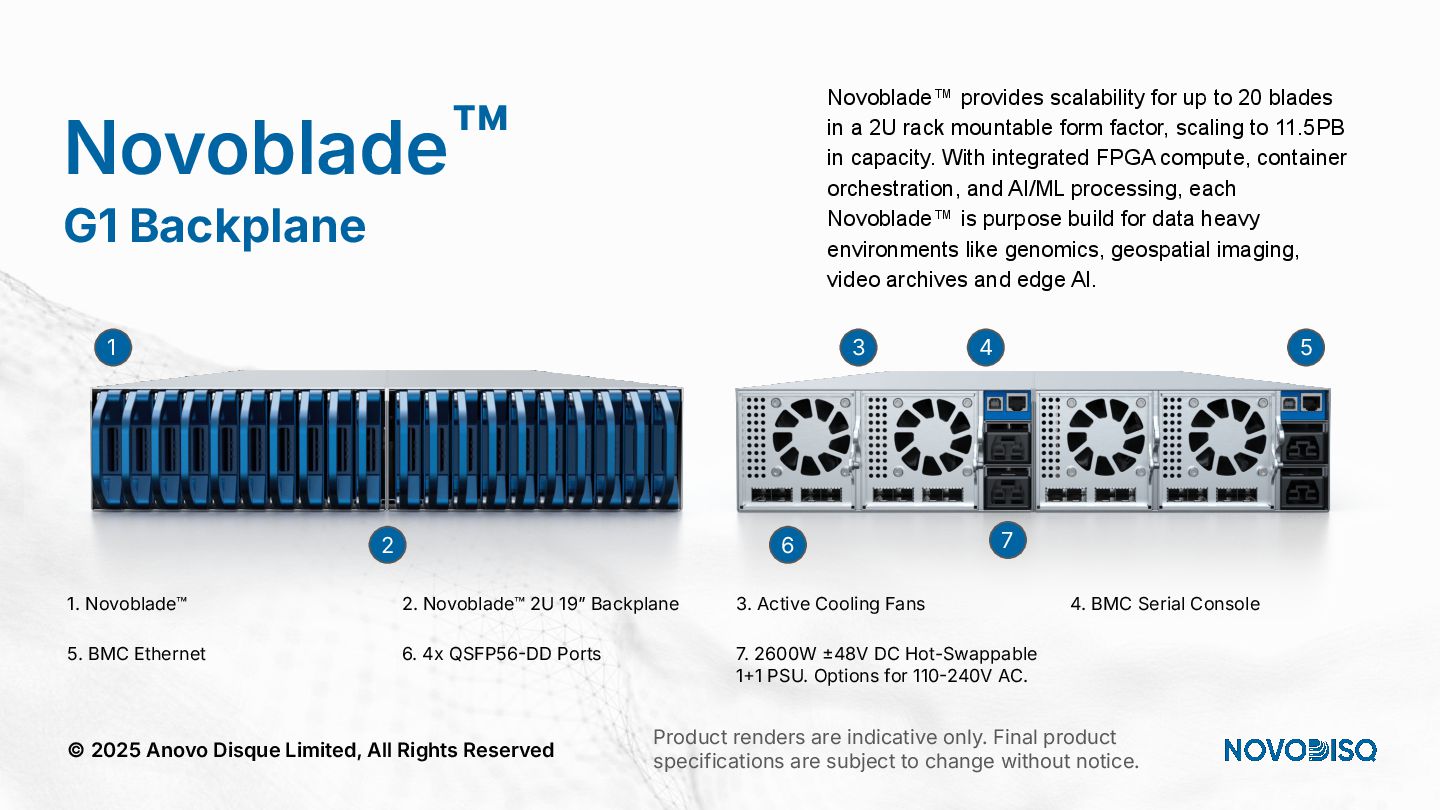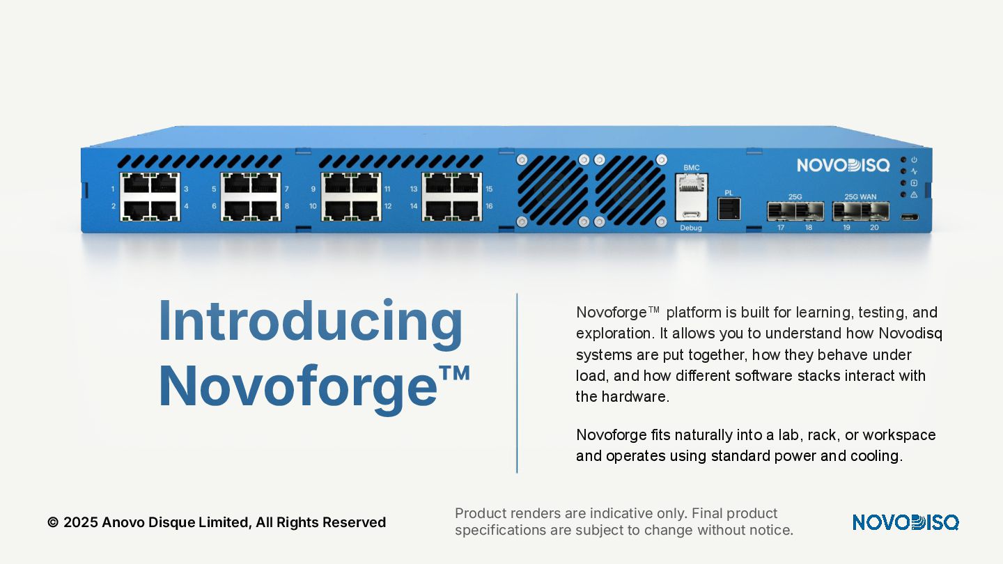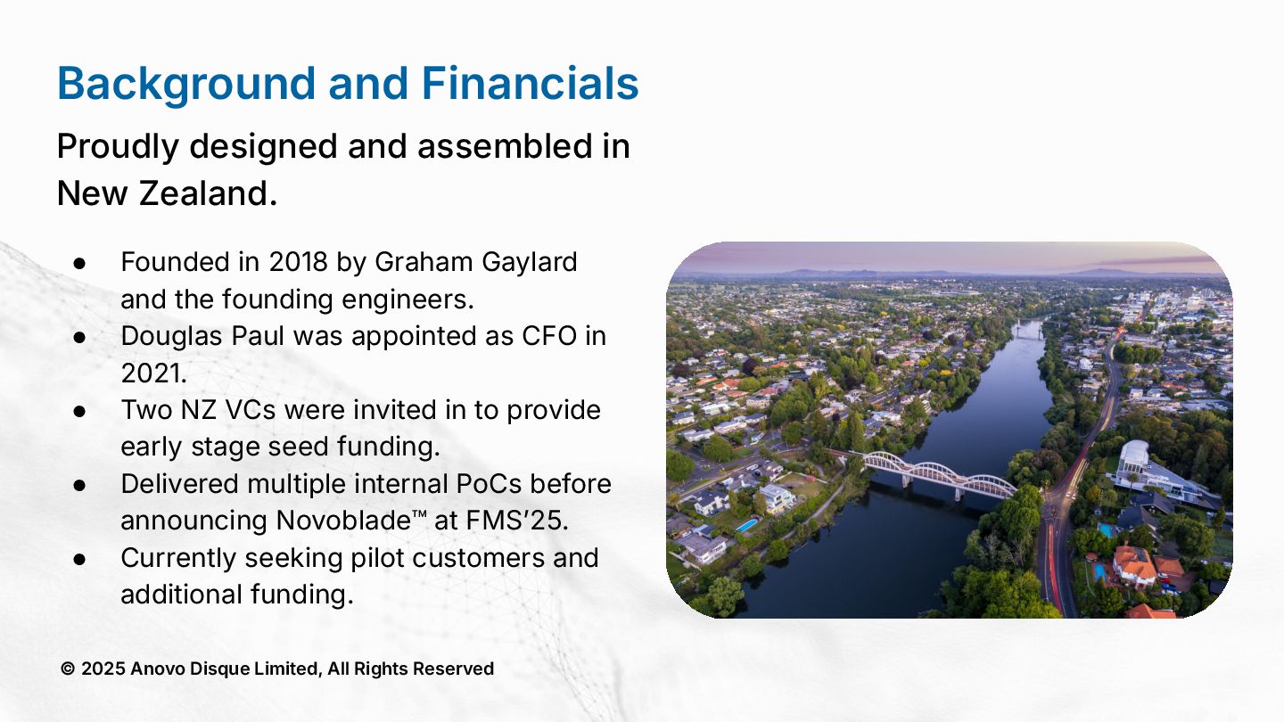 architecture across DC, SME, and Edge. © 2025 Anovo Disque Limited, All Rights Reserved A unique position in an increasingly constrained market Hyperscalers Oligopolistic, expensive, power hungry, sovereignty challenges. Legacy Storage Pure, WD, Huawei) = low density, high opex. Regional Integrators Patchwork systems, not AI pipelines. Novodisq Unique platform combining power efficiency, density, sovereignty and AI ingestion.