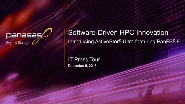 8 - Announced Nov 13, 2018 Fast Simple Flexible Cost-Effective Up to 75GB/s per rack Delivered as an appliance with PanFS8 - the only plug-and-play portable parallel file-system Competitive cost of acquisition and the lowest cost to maintain and administer Seamlessly adapts to changing workloads; Linux and COTS hardware for rapid technology adoption