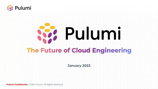 source! ◦ Entire SDK Apache-2.0 license (CLI, libraries, resource providers) ◦ Fast-growing community: 13K stars, 2.7K contributors, 40K pull requests • Pulumi Service SaaS designed to work perfectly with it ◦ Similar to how Git and GitHub go hand in hand ◦ Reliable and secure state store, concurrency control ◦ Security, policies and identity ◦ Collaboration and project/stack management at scale • Pulumi Service delivers best Security, Reliability, and Ease-of-Use ◦ Identity, SAML/SSO, RBAC, Audit Logs, Policy Enforcement, Webhooks, More ◦ Multi-tenanted, SOC 2 compliant SaaS used by Global 2K – or Self-Host anywhere (even airgapped) ◦ Advanced Support Options with Pulumi Service (SLAs, Slack, Training, Workshops, etc) Pulumi Confidential. © 2022 Pulumi. All Rights Reserved