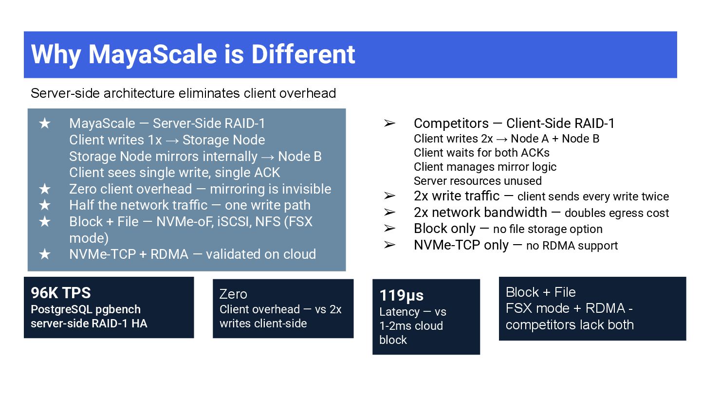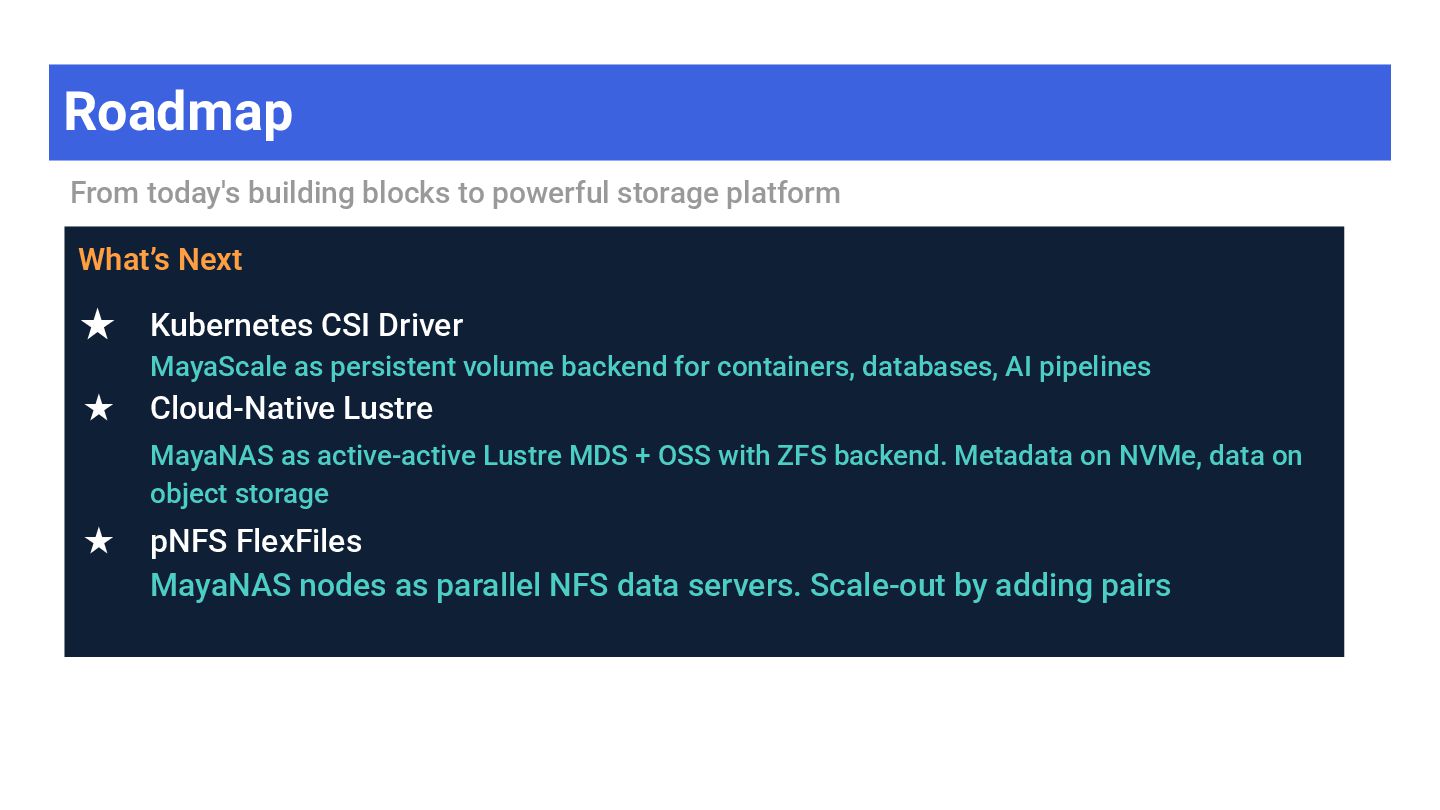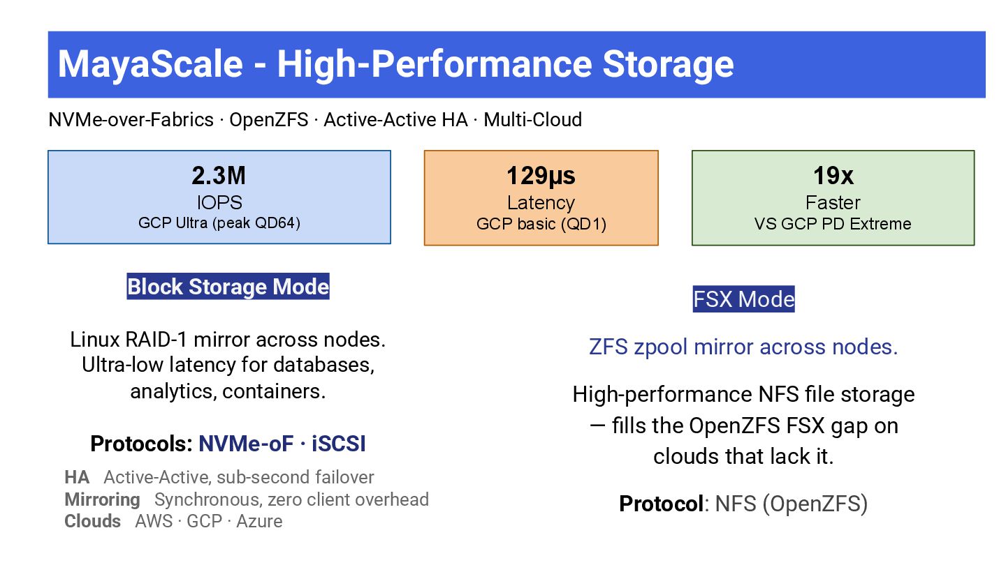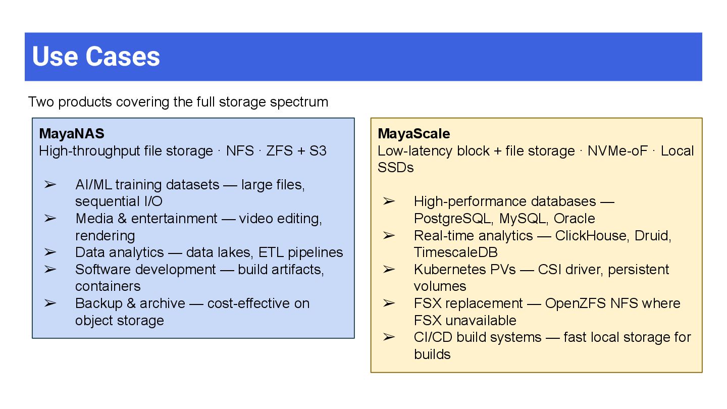 High-throughput file storage · NFS · ZFS + S3 ➢ AI/ML training datasets — large files, sequential I/O ➢ Media & entertainment — video editing, rendering ➢ Data analytics — data lakes, ETL pipelines ➢ Software development — build artifacts, containers ➢ Backup & archive — cost-effective on object storage MayaScale Low-latency block + file storage · NVMe-oF · Local SSDs ➢ High-performance databases — PostgreSQL, MySQL, Oracle ➢ Real-time analytics — ClickHouse, Druid, TimescaleDB ➢ Kubernetes PVs — CSI driver, persistent volumes ➢ FSX replacement — OpenZFS NFS where FSX unavailable ➢ CI/CD build systems — fast local storage for builds